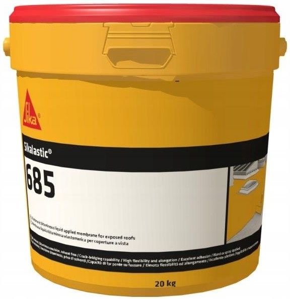 SIKA SIKALASTIC 685 GREY JEDNOSKŁADNIKOWA MEMBRANA BITUMICZNA CZARNA 20 kg. SIKA Sikalastic 685 - Jednoskładnikowa, odporna na promieniowanie UV membrana bitumiczna nakładana w postaci płynnej Sikalastic®-685 jest jednoskładnikową, wodorozcieńczalną, elastomerową, bitumiczną membraną nakładaną w postaci płynnej przeznaczoną do hydroizolacji dachów. Sikalastic®-685 jest elastyczna, odporna chemicznie i odporna na promieniowanie UV, co zapewnia trwałe rozwiązanie. Może być okazjonalnie obciążona ruchem pieszym. kolor: czarny opakowanie: 20 kg Sikalastic®-685 może być stosowana do Izolacji przeciwwodnej dachów eksponowanych płaskich i stromych Izolacji przeciwwodnej zewnętrznych tarasów i balkonów Izolacji rynien i korytek Uszczelniania ścianek attykowych i obróbek blacharskich Uszczelniania zakładek membran bitumicznych Uszczelniania połączeń i szczelin Membrana Sikalastic®-685 nie jest przeznaczona do stałego zanurzenia w wodzie. Membrana Sikalastic®-685 nie jest przeznaczona do kontaktu z wodą pitną. CHARAKTERYSTYKA / ZALETY Bezspoinowa, co zmniejsza ryzyko przecieku wody Dobra odporność na promieniowanie UV Dobra trwałość Niska emisja LZO Bardzo dobra zdolność do mostkowania rys Bardzo dobre wydłużenie Materiał jednoskładnikowy, gotowy do użycia Łatwa aplikacja Przenosi przemieszczenia podłoża, zapewniając szczelność Płytki mogą być układane bezpośrednio na membranie Przylega na całej powierzchni, co zapobiega podciekaniu wody Aplikacja pędzlem, wałkiem, pacą lub natryskiem bezpowietrznym