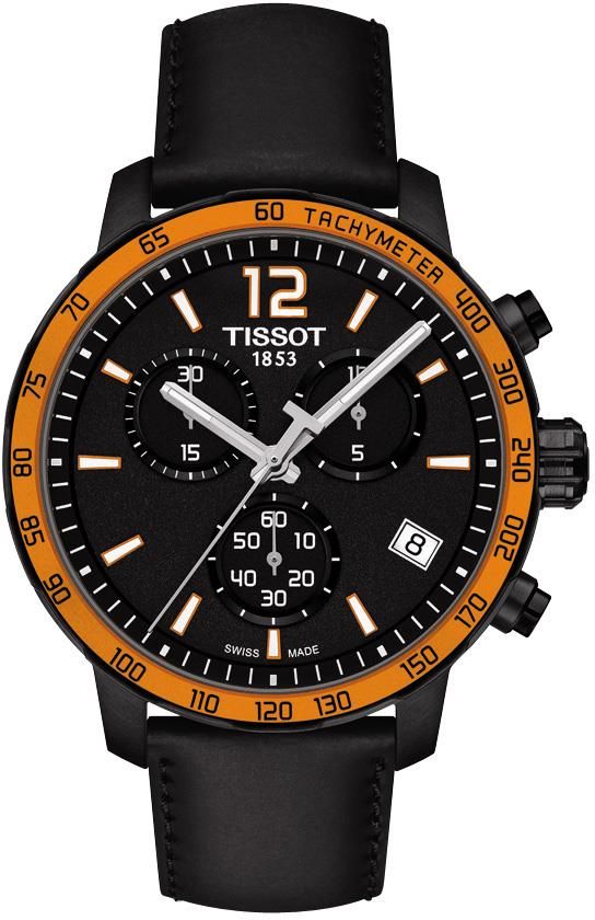 Zegarek Tissot Quickster Chronograph T095. 417. 36. 057. 01 (T0954173605701) jest to elegancki zegarek męski z kolekcji Quickster T-sport. Tissot Quickster to nowoczesny sportowy chronograf dla młodych i dynamicznych osób, które cenią pewien poziom klasy. Zegarek wyróżnia się bardzo cienkim pierścieniem lunety, który sprawia, że tarcza jest jeszcze lepiej widoczna. Pierścień wykonano z kolorowego aluminium, które dodaje zegarkowi nowatorskiego, świeżego wyglądu. Zegarek wyposażony jest w mechanizm kwarcowy, w którym do odmierzania czasu stosuje się kryształ kwarcu drgający pod wpływem energii elektrycznej. Szkiełko szafirowe zapewnia bardzo wysoką odporność na zarysowania oraz przejrzystość. Mechanizm zegarka został umieszczony w okrągłej kopercie z wysokiej jakości stali szlachetnej w kolorze pomarańczowo-czarnym. Pasek wykonany ze skóry w kolorze czarnym, podkreśla elegancki charakter zegarka. Wodoszczelność na poziomie 100 m (10 ATM, 10 Bar). T095. 417. 36. 057. 01 (T0954173605701) dodatkowo wyposażony jest w datownik, chronograf. Sprzedawany przez firmę MARKO zegarek jest fabrycznie nowym, oryginalnym produktem firmy Tissot, pochodzącym z legalnej i oficjalnej dystrybucji. Na życzenie oferujemy bezpłatny grawer. Dostawa zegarka jest bezpłatna. Istnieje możliwość obejrzenia go na żywo w sklepach MARKO oraz sklepach partnerskich (informacja o punktach znajduje się w zakładce O nas). Model zegarka objęty jest 2 letnią gwarancją producenta oraz Pakietem Korzyści Marko. Model T095. 417. 36. 057. 01 (T0954173605701) dostępny na raty. Krzyż w logo firmy symbolizuje szwajcarską jakość i niezawodność, z których Tissot słynie już od 1853 roku. Sprzedawane w ponad 160 krajach świata czasomierze Tissot powstają z wyjątkowych materiałów, urzekają funkcjonalnością i wyszukanym wzornictwem oraz oferowane są w przystępnej cenie. Marka pozostaje wierna swojemu hasłu „Innovators by Tradition", nieustannie pracując nad kolejnymi pionierskimi rozwiązaniami. Zegarmistrzowska precyzja Tissot była wielokrotnie doceniana. Tissot pełni rolę Oficjalnego Chronometrażysty i Partnera koszykarskiej ligi NBA oraz międzynarodowej federacji koszykówki FIBA i chińskiej ligi koszykówki CBA, wyścigu kolarskiego Tour de France oraz unii UCI i organizowanych przez nią mistrzostw świata w kolarstwie szosowym, zawodów motocyklowych MotoGP™ oraz FIM World Superbike, a także francuskiej ligi rugby TOP14 i rozgrywek rugby: Pucharu Sześciu Narodów oraz Europejskiego Pucharu Champions i Challenge. Podobny zaszczyt spotkał markę Tissot w przypadku mistrzostw świata w szermierce i hokeju na lodzie oraz australijskiej ligi futbolowej AFL. Oficjalna strona Tissot: www. tissotwatches. com