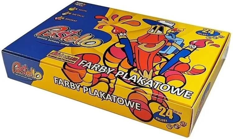 Farby plakatowe 24 kolorów. 12 kolorów podstawowych, 4 kolory brokatowe (zielony, niebieski, fioletowy, czerwony), 4 kolory metalizowane (złoty, srebrny, różowy, niebieski), 4 kolory neonowe (różowy, zielony, żółty, pomarańczowy). Pojemność 20 ml.