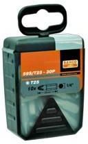 Mocowanie: 1/4" DIN 3126-C 6,3, ISO 1173 Wykończenie: fosforan cynku Materiał: wysokiej jakości stal stopowa Zastosowanie: uniwersalne również w przemyśle 30 szt. w plastikowo-gumowym pudełku Article 59S/T10-30P 1 7314150200870 T10 2.74 mm 25 mm 180 g 59S/T15-30P 1 7314150200887 T15 3.27 mm 25 mm 180 g 59S/T20-30P 1 7314150200894 T20 3.86 mm 25 mm 180 g 59S/T25-30P 1 7314150200900 T25 4.43 mm 25 mm 180 g 59S/T30-30P 1 7314150200924 T30 5.52 mm 25 mm 180 g 59S/T40-30P 1 7314150200931 T40 6.65 mm 25 mm 180 g