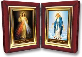 Drewniany dyptyk w aksamitnej bordowej oprawie, z wizerunkiem Jezusa Miłosiernego i Matki Bożej Niepokalanej. Do postawienia w wybranym miejscu. Wymiary po rozłożeniu: 18 x11,5 cm