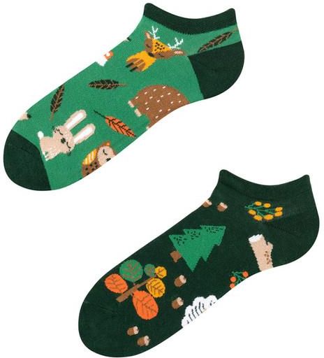 Kolorowe skarpetki stopki: TODO SOCKS, model: FOREST ANIMALS Na skraju bukowego lasu toczy się prawdziwy wiec wolnościowy. Brunatne niedźwiedzie głośno domagają się świętego spokoju. Wybudzający ich z błogiego snu, mogą doświadczyć konfiskowania najbardziej wybornych smakołyków. Forest Animals zrzesza sympatyków dzikiej społeczności. Sowa, lis, zając i jeż zasilają szeregi organizacji. Kto z Was zgadza się, że czas zakończyć bombardowania dzikiej społeczności? Czystość i cisza, to hasła przewodnie. Włóż na stopy kolorowe skarpety Forest ANIMALS i pokaż, że leśni przyjaciele mają nasze poparcie! Prawa skarpeta przedstawia zwierzęta żyjące w lesie: sowy, sarny, zające. Druga stopka obrazuje drzewa i inne rośliny, które tworzą las. Całość utrzymana jest w odcieniach zieleni. Właściwości i cechy stopek na lato: Te skarpetki pozostają niewidoczne po założeniu obuwia, dzięki czemu świetnie pasują do mokasynów, balerin, sneakersów oraz butów sportowych. Wykonane z wysokiej jakości, oddychającej bawełny, zapewniają komfort noszenia nawet w upalne dni – Twoje stopy pozostaną suche, świeże i wolne od nieprzyjemnych zapachów. Miękki i elastyczny materiał doskonale przylega do stopy, oferując lekkość i pełną swobodę ruchów przez cały dzień. Skarpetki szybko schną i są łatwe w pielęgnacji, co czyni je wygodnym rozwiązaniem zarówno na co dzień, jak i w podróży. Dodatkowo ich uroczy wygląd wprowadzi pozytywny nastrój i subtelny urok – nawet jeśli pozostaną ukryte przed wzrokiem innych! TODO SOCKS to polska marka specjalizująca się w tworzeniu kolorowych, nie do pary skarpetek, które przyciągają wzrok i wywołują uśmiech. Nasze produkty wyróżniają się najwyższą jakością wykonania oraz oryginalnym, pełnym humoru designem. To doskonały pomysł na prezent – nie tylko praktyczny, ale i wyjątkowo zabawny. Skarpetki TODO są w 100% projektowane i produkowane w Polsce, z dbałością o każdy detal i z wykorzystaniem najlepszej jakości bawełny. Dobieraj je według swojego humoru, zainteresowań czy pory roku i łam modowe schematy. Kolorowe skarpetki nie do pary to manifest wolności, radości i kreatywności – noś je dumnie i z uśmiechem. TODO SOCKS to więcej niż marka – to społeczność pozytywnych buntowników, którzy wierzą, że odmienność jest źródłem najlepszych idei. Skład wesołych skarpet TODO SOCKS 80 % Bawełna, 17 % Poliamid, 3 % Elastan. Lewa i prawa skarpetka jest inna, tak, jak na zdjęciu. Jak dbać o kolorowe skarpety, aby zachowały idealny kolor i trwałość? Pierz skarpety maksymalnie w 30 stopniach, Susz wesołe nie do pary w pozycji pionowej, Nie susz skarpet TODO SOCKS bębnowo, Poświęć czas na relaks, nie prasuj kolorowych skarpet :) TODO SOCKS nie lubią wybielania.