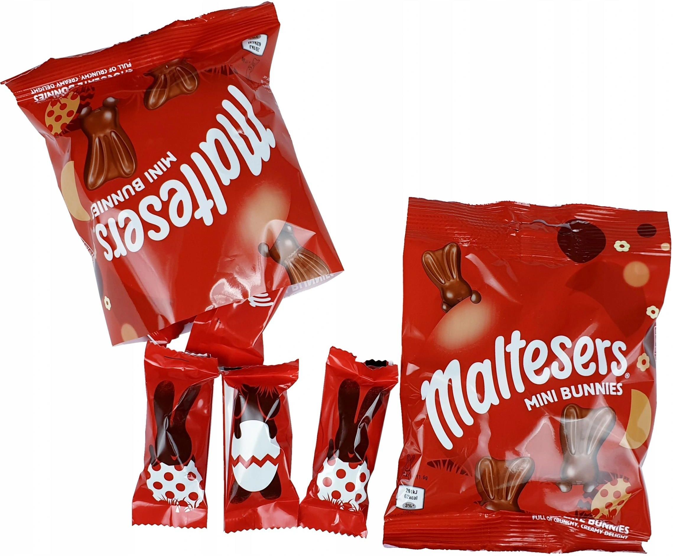 MALTESERS - MINI BUNNIES Opakowanie zawiera 58 g Czekoladowe batoniki w kształcie zajączków , z chrupiącym nadzieniem W opakowaniu znajdują się zajączki i każdy pakowany jest osobno Data ważności:09/2022