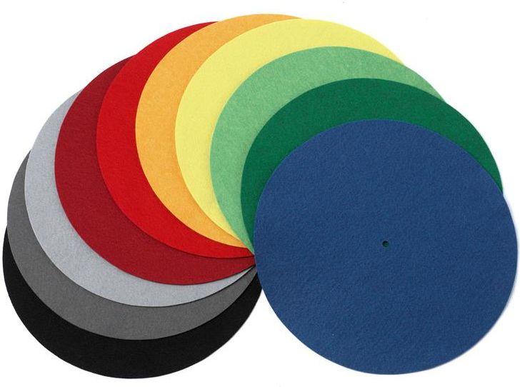 Pro-Ject Mata filcowa 28cm Cechy: Mata filcowa do gramofonu. Średnica - 28cm Grubość: około 2mm Kolor czarny lub: ciemno szary, szary, ciemno czerwony, czerwony, pomarańczowy, żółty, jasno zielony, zielony, niebieski Funkcjonalność: Gramofon jak każde analogowe urządzenie mechaniczne wymaga szczególnej dbałości podczas eksploatacji. Fundamentem optymalnej pracy każdego gramofonu jest dbanie o czystość igły wkładki oraz płyt. W tym celu każdy użytkownik gramofonu powinien posiadać szczotki – oddzielną do czyszczenia płyty oraz igły. Ponadto producenci oferują gotowe myjki do płyt oraz specjalne płyny. Bardzo dobrym rozwiązaniem, które pozwala zachować gramofon w należytej czystości jest pokrywa. Zaś w przypadku płyt gramofonowych pistolet antystatyczny. Dodatkowo dłuższą żywotność płyt zapewnia wysokiej klasy mata. Aby gramofon mógł być prawidłowo eksploatowany najpierw należy skalibrować go z wkładką. W tym celu niezbędny jest szereg akcesoriów: przeciwwaga, poziomica, waga do pomiaru, szablon. Akcesoria mogą także służyć do bezpośredniej korekcji brzmienia systemu stereo. Mowa tu o na przykład o dociskach płyt, które słyszalnie wpływają na poprawę brzmienia – dzięki zredukowaniu wibracji podczas kontaktu igły z płytą winylową.