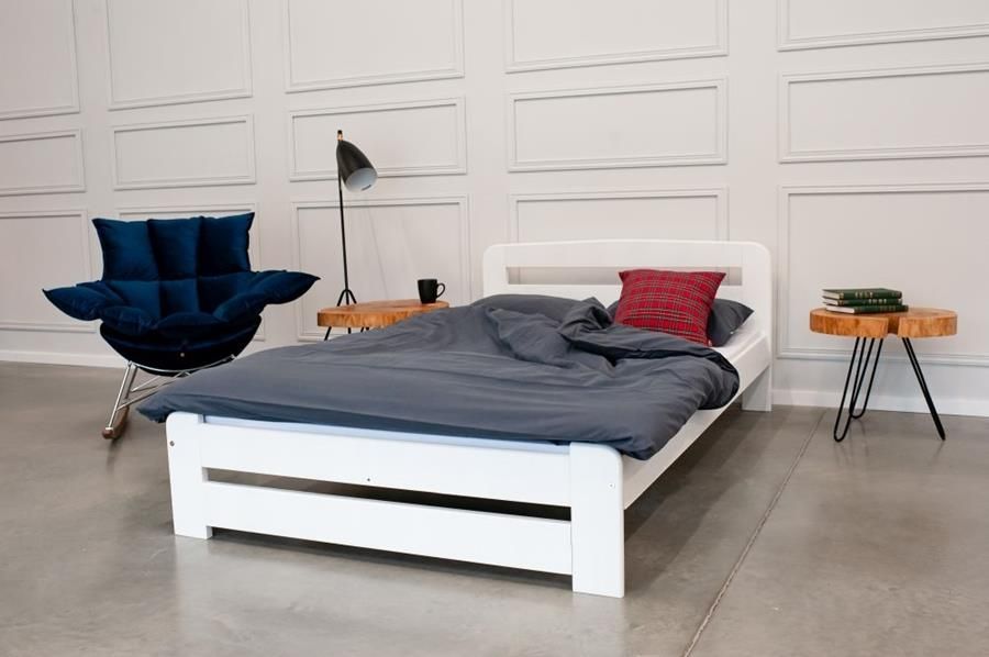 Łóżko Hubert 120x200 białe. Łóżko wykonane w całości z drewna sosnowego. Grubość materiału 2,7 cm. W cenie łóżka wliczony jest wkład drewniany pod materac. Stabilna konstrukcja z drewna sosnowego dostarcza niezwykły komfort snu. Łóżko posiada listwę środkową i 5 nogę - dodatkowe wzmocnienie. Nowoczesne proste wzornictwo Łóżko jest bejcowane na kolor następnie lakierowane lakierem bezbarwnym metodą natryskową Mebel wysyłany w paczce do samodzielnego montażu wraz z instrukcją oraz akcesoriami . Podana cena nie obejmuje szuflady i materaca i dodatków ,istnieje jednak możliwość ich nabycia za dodatkową opłatą. Na łóżku z czasem mogą występować przebarwiające się sęki. Wymiary łóżka : Szerokość wewnętrzna 120 cm długość wewnętrzna 200 cm szerokość zewnętrzna 128 cm długość zewnętrzna 208 cm wysokość łóżka przy głowie 70 cm wysokość łóżka przy nogach 34 cm