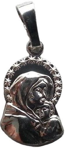 Medalik srebrny przedstawiający Matkę Boską z Dzieciątkiem Jezus. Technologia wykonania medalika – matryca. Waga: 1.6 g Metal: Srebro Ag 0,925 Wykończenie srebra: gładkie