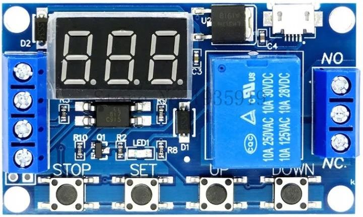 Moduł Przekaźnika Czasowego USB-C ✅ Zasilanie: 6V - 20V lub USB-C 5.0V (dla zasilania powyżej 20V należy zastosować przetwornicę step down np. LM2596 i ustawić napięcie na 8-10V) ✅ Trigger (wyzwalacz): 3,8V - 20V ✅ Zakres czasu: 0-999 minut ✅ Temperatura pracy: -40°C do 85°C ✅ Wymiary: 62mm x 38mm x 19mm ✅ Przekaźnik: 10A, 230V AC / 30V DC ✅ Przyciski: STOP: włącz/wyłącz przekaźnik (odliczanie działa - przekaźnik wyłączony) SET (długie naciśnięcie): wybór funkcji i przejście do atrybutów SET (krótkie naciśnięcie): wyświetlenie atrybutów funkcji ✅ Procedura programowania: Naciśnij przycisk STOP, wybierając opcję ON. Poczekaj, aż na wyświetlaczu pojawi się 000. Wciśnij długo SET -> Wybierz program przyciskami UP / DOWN. Wciśnij krótko SET -> Migające OP na wyświetlaczu -> 000 -> Wprowadź długość trwania atrybutu przyciskami UP / DOWN. Przyciskiem STOP wybierz jednostkę czasu: 000 -> Sekunda 00.0 -> Dziesiąta część sekundy (np. 05.5 = 5,5 sekundy) 0.0.0 -> Minuta (np. 0.0.1 = 1 minuta) Wciśnij długo SET -> Po zakończeniu migania numeru programu np. P1.1 procedura zostanie zakończona. ✅ Opis programów: P1.1: Po podaniu sygnału Triggera włączenie przekaźnika i odliczanie czasu ustawionego w OP, po czym przekaźnik się wyłącza. P1.2: Jak wyżej, ale podanie sygnału Triggera podczas odliczania powoduje odliczanie od 0. P1.3: Jak wyżej, ale podanie sygnału Triggera podczas odliczania powoduje wyłączenie przekaźnika i reset odliczania. P-2: Po podaniu sygnału Triggera odliczanie czasu CL, następnie włączenie przekaźnika i odliczanie OP, po czym przekaźnik się wyłącza. P3.1: Po podaniu sygnału Triggera włączenie przekaźnika i odliczanie OP, wyłączenie przekaźnika i odliczanie CL, cykl powtarzany określoną ilość razy (LOP = nieskończona pętla), podanie Triggera podczas odliczania wyłącza przekaźnik i resetuje odliczanie. P3.2: Po podłączeniu zasilania automatyczne włączenie przekaźnika i odliczanie OP, wyłączenie przekaźnika i odliczanie CL, cykl powtarzany określoną ilość razy (LOP = nieskończona pętla). P-4: Po podaniu Triggera włączenie przekaźnika, odliczanie OP zaczyna się po zniknięciu Triggera, podanie Triggera podczas odliczania resetuje licznik. ✅ Funkcja 3.2: Pozwala na działanie modułu bez Triggera. W momencie, gdy zasilimy moduł czasowy przez gniazdo microUSB 5V lub przez złącze 6V - 20V, moduł zaczyna odliczanie automatycznie, bez konieczności wyzwalania startu. Funkcja ta umożliwia nieskończoną lub określoną ilość cykli pracy przekaźnika.