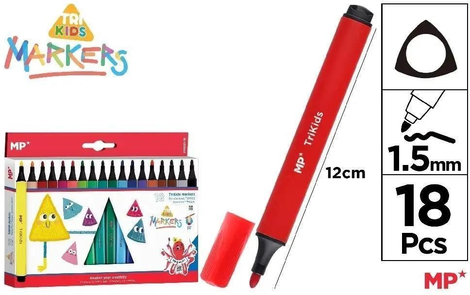 Flamastry Szkolne Trójkątne - Zestaw 18 Kolorów Flamastry szkolne o trójkątnym kształcie, dostępne w zbiorze 18 różnorodnych kolorów, to doskonały wybór dla wszystkich młodych artystów. Każdy zestaw składa się z 18 flamastrów, które łączy innowacyjny projekt ergonomicznej obudowy. Dzięki swojemu trójkątnemu designowi, flamastry są wygodne w trzymaniu i pomagają w rozwijaniu prawidłowego uchwytu u dzieci. Bogata gama barw pozwala na stworzenie pięknych i kreatywnych dzieł. To niezastąpione narzędzia w każdej szkolnej wyprawce. Flamastry z serii MP gwarantują wysoką jakość i trwałość, co przekłada się na dłuższą satysfakcję z użytkowania. Zachęcamy do odkrycia bogactwa kolorów i rozwijania pasji do sztuki z zestawem trójkątnych flamastrów. EAN: 8435250912568