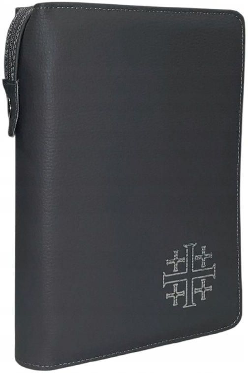 Ekskluzywne etui na Biblię Jerozolimską – w kolorze szarym ze srebrnym zdobieniem Poszukujesz eleganckiego etui, które nie tylko ochroni twoją Biblię Jerozolimską, ale także podkreśli jej wyjątkowy charakter? Oto wysokiej klasy etui na Biblię Jerozolimską w dużym formacie, które łączy funkcjonalność z wyrafinowanym stylem. Etui w szarym kolorze to doskonały prezent na chrzciny, bierzmowanie, jubileusz czy każdą inną okazję. Jego elegancki, ale prosty design z pewnością przypadnie do gustu każdemu odbiorcy. Na froncie widnieje subtelny, srebrny krzyż jerozolimski, który nadaje okładce wyjątkowy, a zarazem uniwersalny wygląd. Ochrona i funkcjonalność Trwałe materiały: Wysoka jakość wykonania zapewnia ochronę przed zabrudzeniami, uszkodzeniami i zużyciem podczas codziennego użytkowania. Idealne dopasowanie: Etui stworzone z myślą o dużym formacie Biblii Jerozolimskiej (17,5 x 24,5 cm), co gwarantuje wygodne i bezpieczne przechowywanie. Zapięcie na suwak: Solidny suwak chroni zawartość i ułatwia dostęp do Biblii w każdej chwili.