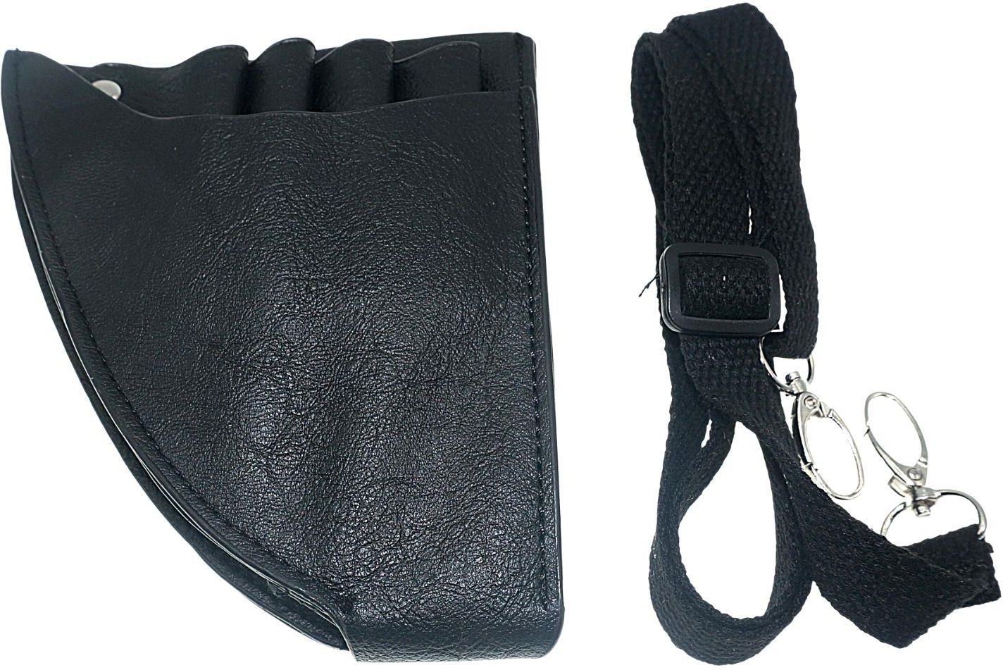 Czarna kabura na akcesoria fryzjerskie, zakładana na pas. Z wieloma przegrodami na wszystkie potrzebne sprzęty, nożyczki, grzebienie, klipsy i inne. Dostępny kolor: czarny. Wymiary : 14 x 16,5 cm. Kabura posiada jedną dużą kieszeń, druga kieszeń ma 4 uchwyty na nożyczki oraz możliwość przypinania klipsów, spinek. Do kabury dołączony jest pasek do przypięcia na odzieży, jest także mozliwość przypięcia kabury bezpośrednio do paska jako dodatkowej kieszeni.