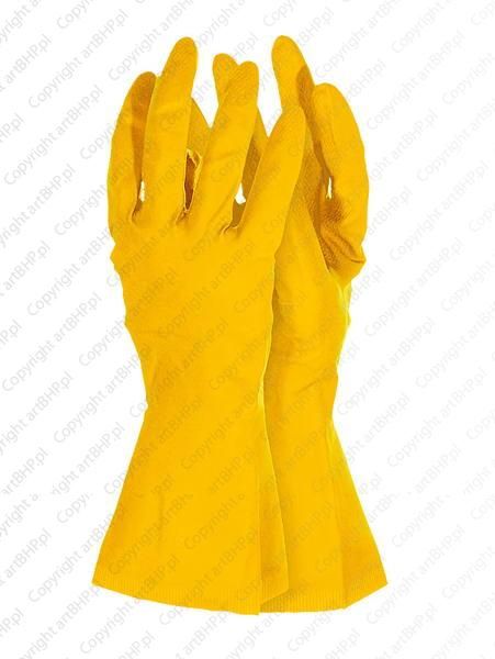 Rękawice Ochronne Gumowe RFROSE Y Flokowane wewnątrz Szorstka część chwytna Żółte Rozmiar S Rękawice ochronne gumowe flokowane. 100% kauczuk naturalny wewnętrzna powierzchnia pokryta flokiem (pyłem bawełnianym), co ułatwia wkładanie i zdejmowanie rękawic oraz zapobiega poceniu się rąk w czasie użytkowania na części chwytnej chropowata struktura dzięki czemu rękawiczki zyskują lepszą przyczepność grubość części chwytnej: 0,46 mm odporne na rozciąganie wysoka odporność na detergenty i środki piorące doskonale sprawdzą się w gospodarstwach domowych wykorzystywane do ogólnych prac mechanicznych każda para pakowana w osobną torebkę, dzięki czemu świetnie się prezentują i są idealne na wszelkiego rodzaju prezentacje potocznie zwane jako floki lub rękawice gospodarcze zgodne z normą EN420 rozmiary: S - XL