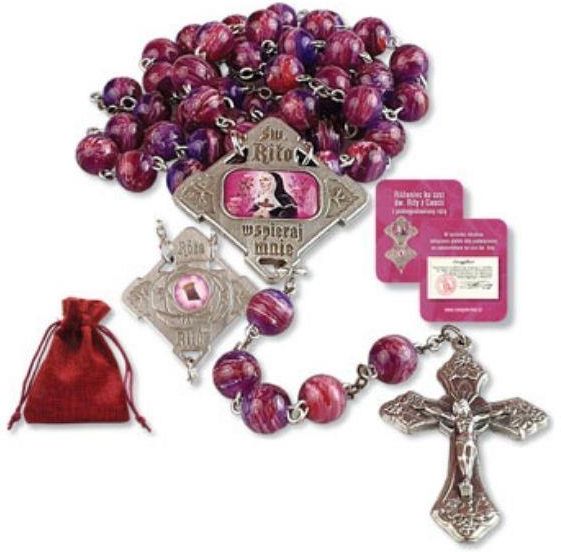 Okazały, duży łącznik z modlitewną inskrypcją (św. Rito wspieraj mnie), wybity specjalnie do tego różańca. W łączniku-medaliku zatopiono płatek róży poświęconej na nabożeństwie ku czci św. Rity (potwierdzone certyfikatem). Różaniec przygotowany z myślą o czcicielach św. Rity, patronki od spraw najtrudniejszych. Ozdobą tego pięknego różańca jest specjalnie zaprojektowany i wybity okazaty łącznik. Obok wizerunku Świętej i modlitewnej inskrypcji, zatopiono w nim drobinki płatków róż poświęconych na tradycyjnym nabożeństwie ku czci Świętej odprawianym każdego 22- go dnia miesiąca w kościele św. Katarzyny w Krakowie. Każdy różaniec certyfikowany, wygodne jutowe etui.