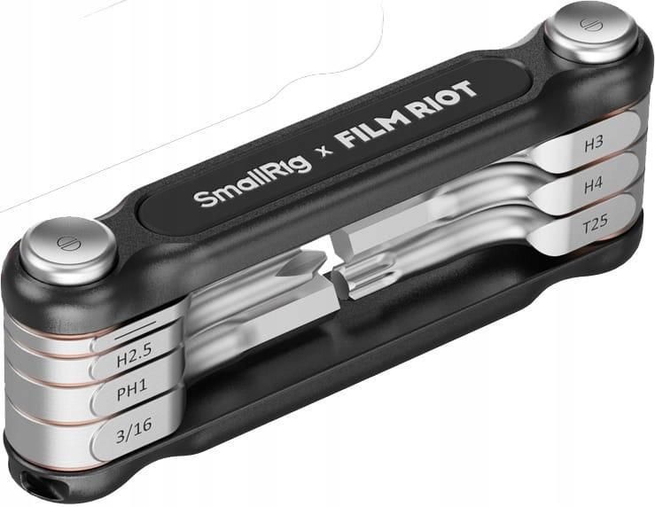 SmallRig 4374 x FILM RIOT zestaw kluczy 7w1 z możliwością ustawienia pod różnymi kątami, czarnyCharakterystyka Klucze umożliwiają mocowanie pod kątem 90° lub 180°. Przenośna, składana konstrukcja dla wygodnego przechowywania i transportu. Zestaw kluczy 7 w 1 zawiera cztery klucze imbusowe 2,5 mm, 3 mm, 4 mm, 3/16, jeden klucz płaski, jeden klucz krzyżakowy i jeden klucz Torx T25. Metalowa konstrukcja z silikonową powłoką zapewnia antypoślizgowy, przyjazny dla skóry uchwyt i solidną trwałość. Składany zestaw kluczy specjalnie dla branży fotoZaprojektowany specjalnie dla twórców zdjęć i filmów. Zestaw 7 w 1 ma składaną konstrukcję, która zapewnia przenośność i wygodę, obejmując popularne rozmiary kluczy w branży fotograficznej i wideo. Wyjątkowa konstrukcjaDzięki wyjątkowej, opatentowanej konstrukcji, każdy klucz można bezpiecznie ustawić pod kątem 90° lub 180°, co ułatwia sprawny montaż i demontaż akcesoriów przed i po strzelaniu. Zestaw posiada antypoślizgową silikonową powłokę zapewniającą wygodny chwyt. Wykonany ze stopu aluminium i stali nierdzewnej zestaw kluczy gwarantuje trwałość i niezawodność. Zawartość zestawu 1x Zestaw kluczy składanych 7w1 1x Etui do przechowywania