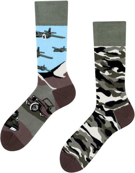 Kolorowe skarpetki: TODO SOCKS, model: LAND OF TANKS Wiesz o czołgach więcej niż to, że składają się z podwozia, nadwozia i lufy? Marusia mogłaby być Twoją żoną, a Szarik wiernym towarzyszem? Uszanowanie! Model Land of Tanks, to coś więcej niż World of Tanks. Skarpety zaawansowane technicznie niczym ruskie czołgi, wytrzymujące promieniowanie rzucane przez wrogich sąsiadów. W modelu uwzględniono również urok samolotów myśliwskich. Design zapewne wpływa na aerodynamiczne właściwości skarpet. Kto wie, może zostaniesz pilotem? Todo SOCKS, to polska marka produkująca kolorowe skarpety nie do pary. Nasze modele charakteryzuje najwyższa jakość oraz niebanalne wzornictwo. Zabawne skarpetki, to idealny pomysł na prezent. Model skarpet LAND OF TANKS , to propozycja dla fanów militarów. Długie skarpety TODO zostały zaprojektowane i wykonane w Polsce z najwyższej jakości bawełny. Dobieraj skarpety do nastroju, zainteresowań, pory roku. Bojkotuj szarą rzeczywistość przemierzając świat w kolorowych skarpetkach nie do pary. Nie bój się odmienności, to ona jest twórcą najlepszych pomysłów. TODO SOCKS to rewolucyjna marka, która łączy niepoprawnych optymistów. Skład wesołych skarpet TODO SOCKS -80 % bawełna -17 % Poliamid -3 % Elastan Lewa i prawa skarpetka jest inna, tak jak na zdjęciu. Jak dbać o kolorowe skarpety, aby zachowały idealny kolor i trwałość? - Pierz skarpety maksymalnie w 30 stopniach, - Susz wesołe nie do pary w pozycji pionowej, - Nie susz skarpet TODO SOCKS bębnowo - Poświęć czas na relaks, nie prasuj kolorowych skarpet :) - TODO SOCKS nie lubią wybielania