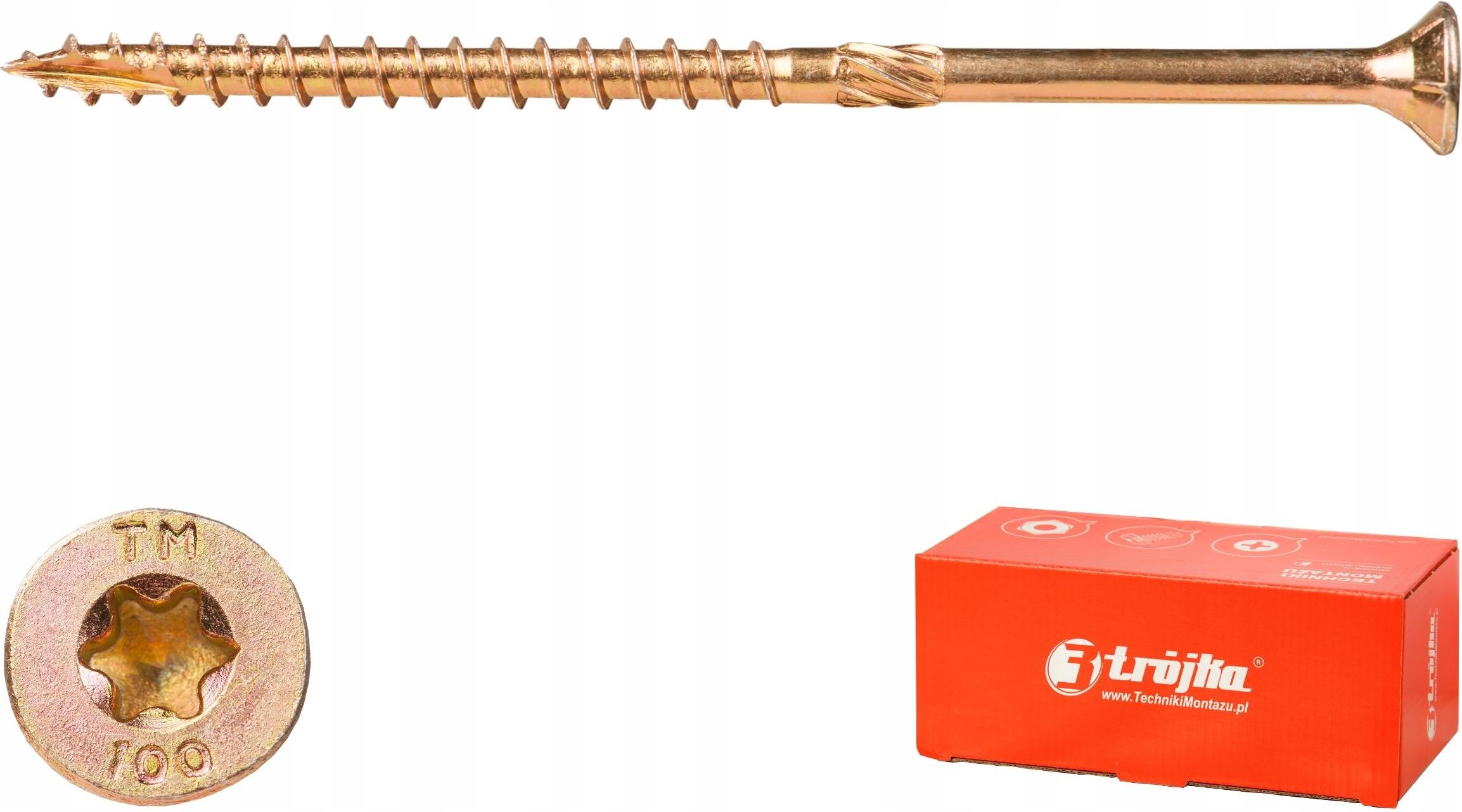 Wkręty hartowane TORX z łbem stożkowym - 3,0x35 - 2000 sztuk PARAMETRY WKRĘT HARTOWANY TORX Średnica [d]: 3.0 mm Długość [L]: 35 mm Długość gwintu [L1]: 16 mm Długość frezu [L2]: 2,5 mm - 5,0 mm Średnica główki [D]: 6 mm Gniazdo TORX: TX10 Ilość w opakowaniu jednostkowym (opJ): 2000 sztuk Norma: DIN 7505, PN-EN 14592:2008+1A:2012 Powłoka: Hartowany, Ocynkowany Galwanicznie OPIS: Wkręty Hartowane TORX TRÓJKA z łbem stożkowym o innowacyjnej konstrukcji, dzięki polepszonym zdolnością do wkręcania się, usprawniają pracę przy montażu konstrukcji drewnianych oraz zapewnia odpowiednią wytrzymałość całej konstrukcji. Wkręty hartowane TORX firmy TRÓJKA zapewniają komfortową pracę przy montażu dzięki: wgłębieniu typu TORX, specjalnej końcówce wiercącej posiadającej karby tnące, frezie rozwiercającym zmniejszającym tarcie w trakcie wkręcania, wypustkom nacinającym w łbie wkręta. Produkt wykonany wg europejskich norm: PN-EN 14592:2008+A1:2012 , posiada certyfikaty i aprobaty. ZALETY ORYGINALNA ETYKIETA TRÓJKA. Dzięki temu wiesz, że kupujesz bardzo dobry, oryginalny produkt, Jakość zatwierdzona atestem PN-EN 14592:2008+A1:2012 Instytutu Techniki Budowlanej ITB, Wykonano ze stali węglowej, wzmocniony przez proces hartowania, Ochronę antykorozyjną zapewnia ocynk galwaniczny, Pasywacja ocynku na kolor złoty idealnie komponuję się z kolorem drewna Estetyczne pudełko, zapewnia bezpieczne przechowywanie produktu Wykonane w najwyższej jakości - Nowoczesne procesy produkcji Cechy wkręta Nacięcie TORX (gniazdo) - gniazdo TORX zapewnia optymalne przeniesienie momentu obrotowego. Łeb stożkowy (główka) - zapewnia dzięki wypustkom nacinającym pełne zagłębienie wkręta w powierzchni podłoża, Frez rozwiercający - frez rozwiercający zmniejsza moment obrotowy oraz chroni drewno przed rozczepieniem Karby tnące - karby tnące umieszczone na początku gwintu przecinają włókna struktury drewna Specjalny frez na ostrzu - ułatwia rozpoczęcie montażu wkręta oraz zapobiega pękaniu drewna