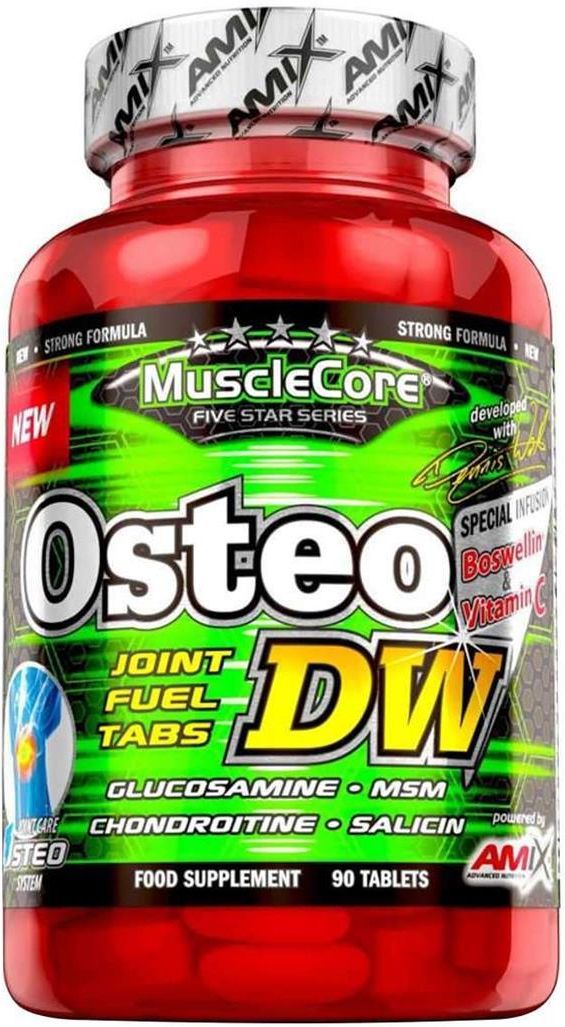 - najlepiej oceniany produktu w swojej kategorii Przekonaj się, dlaczego inni nas wybierają – dołącz do grona zadowolonych klientów Produkt na stawy w tabletkach Amix OsteoDW ⭐ Glukozamina, chondroityna, MSM i więcej Wysoka jakość i dopracowany skład – starannie dobrane substancje pochodzenia roślinnego w jednej formule. Wzmocnienie stawów i działanie przeciwzapalne – idealny wybór przy intensywnym treningu lub dolegliwościach stawowych. Szybsza regeneracja – wspiera odbudowę struktur stawowych i tkanek łącznych. Składniki o potwierdzonej skuteczności: siarczan glukozaminy siarczan chondroityny MSM ekstrakt z kory białej wierzby (Salix alba) Formuła Boswellin® – standaryzowana na 65% kwasu bosweliowego – działa przeciwzapalnie i łagodząco. Wygodna forma – tylko 1 tabletka dziennie wystarczy, by zadbać o stawy – 90 tabletek w jednym pudełku. Nie czekaj – zadbaj o zdrowie swoich stawów i poczuj różnicę z Amix OsteoDW już dziś! Amix OsteoDW ➡️ Skuteczny preparat na stawy i kości OsteoDW od Amix to zaawansowany suplement diety stworzony z myślą o tych, którzy nie uznają kompromisów – zarówno na siłowni, jak i poza nią. To wsparcie dla Twoich stawów, które nie tylko pomaga je wzmocnić, ale także przyspiesza ich regenerację, gdy najbardziej tego potrzebujesz. Idealny dla profesjonalnych sportowców, kulturystów, biegaczy i wszystkich, którzy codziennie testują granice swojej wytrzymałości. Ale nie tylko – OsteoDW świetnie sprawdzi się również u osób trenujących rekreacyjnie, które chcą zadbać o swoje stawy zawczasu i cieszyć się ruchem bez bólu. Zadbaj o nie już dziś – sięgnij po OsteoDW i poczuj różnicę! Preparat na stawy Amix OsteoDW to idealny produkt dla • Zawodowych sportowców oraz osób przygotowujących się do zawodów • Pasjonatów sportów siłowych i wytrzymałościowych • Osób aktywnych fizycznie, które chcą zadbać o zdrowie stawów i przeciwdziałać kontuzjom • Trenujących rekreacyjnie, którzy chcą zachować komfort ruchu na dłużej • Osób w średnim i starszym wieku, które szukają wsparcia dla układu ruchu Najważniejsze właściwości Składniki aktywne Amix OsteoDW – co sprawia, że działa? Amix OsteoDW to zaawansowany kompleks na stawy, zawierający siarczan glukozaminy i chondroityny – składniki wspierające regenerację chrząstki, MSM – źródło siarki o działaniu przeciwzapalnym, oraz witaminę C – wspomagającą produkcję kolagenu. Dodatkowo wzbogacony o ekstrakty z Boswellia serrata (65% kwasów bosweliowych) i kory wierzby białej, które pomagają łagodzić stany zapalne i ból stawów. Moc Boswellin® – Przełom w dbałości o stawy OsteoDW od Amix zawiera wysokiej jakości ekstrakt z Boswellia serrata, standaryzowany aż na 65% kwasów bosweliowych – składników aktywnych o silnym działaniu przeciwzapalnym. Kwasy bosweliowe skutecznie hamują enzymy prozapalne, takie jak 5-lipoksygenaza i elastaza leukocytarna, które odpowiadają za rozwój stanów zapalnych i degradację tkanek stawowych. Siarczan glukozaminy Wspiera regenerację chrząstki stawowej, zmniejsza ryzyko chorób zwyrodnieniowych i spowalnia utratę sprawności stawów. Siarczan chondroityny Chroni stawy przed ścieraniem, wspomaga ruchomość i elastyczność chrząstki. Działa synergicznie z glukozaminą. MSM (metylosulfonylometan) Naturalna siarka organiczna – działa przeciwzapalnie, wspiera syntezę kolagenu i odbudowę tkanki łącznej, redukuje ból. Witamina C Silny antyoksydant – wspiera syntezę kolagenu, chroni komórki przed stresem oksydacyjnym i przyspiesza regenerację tkanek. Ekstrakt z kory białej wierzby (Salix alba) Naturalne źródło salicylanów – działa przeciwzapalnie i przeciwbólowo. Wspomaga walkę z obrzękami i stanami zapalnymi stawów. Najczęściej zadawane pytania (FAQ) Dla kogo przeznaczony jest OsteoDW? OsteoDW został opracowany z myślą o osobach aktywnych fizycznie – zarówno profesjonalistach, jak i amatorach. Idealnie sprawdzi się u sportowców siłowych, biegaczy, crossfiterów, a także osób, które chcą profilaktycznie zadbać o zdrowie swoich stawów. Jak długo należy stosować OsteoDW, aby zauważyć efekty? Pierwsze efekty – takie jak zmniejszenie dyskomfortu stawowego – można odczuć już po kilku tygodniach regularnego stosowania. Optymalne rezultaty pojawiają się zazwyczaj po 6–8 tygodniach. Czy OsteoDW można stosować profilaktycznie, nawet jeśli nie odczuwam bólu? Zdecydowanie tak! Suplementacja profilaktyczna może pomóc w utrzymaniu stawów w dobrej kondycji i zapobiegać urazom, szczególnie u osób trenujących regularnie. Czy suplement może być stosowany przez osoby starsze? Tak, składniki aktywne zawarte w OsteoDW wspomagają także stawy osób w wieku dojrzałym, pomagając zachować mobilność i sprawność. Czy mogę łączyć OsteoDW z innymi suplementami? Tak, OsteoDW można bezpiecznie łączyć z innymi suplementami – np. witaminą D3, magnezem czy odżywkami białkowymi. W razie wątpliwości warto skonsultować się z dietetykiem lub lekarzem. Skład Średnie wartości odżywcze: Zalecana dawka: 1 tabletka: Liczba porcji w opakowaniu: 90 Siarczan D-glukozaminy 2KCL: 1000 mg * Siarczan chondroityny: 250 mg * MSM (metylosulfonylometan): 250 mg * Witamina C (jako kwas askorbinowy): 100 mg (100%) Ekstrakt z trocin kadzidełkowych Boswellin®: 10 mg * Ekstrakt z kory białej wierzby – Salix alba, 15% salicyny: 10 mg * * Nie ustalono dawki dziennej, DDD – zalecana dawka dzienna,% DDD Składniki (2 tabletki): D-Glukozamina Siarczan 2KCL (Skorupiaki) 2000 mg, Chondroityna Siarczan 90% 500 mg, MSM (metylosulfonylometan) 500 mg, Kwas askorbinowy (Witamina C 160 mg – 200% *), Wyciąg z kadzideł Boswellin ® 20 mg (Boswellia Serrata), ekstrakt z kory białej wierzby 20 mg (kora białej wierzby – Salix alba, 15% salicyny), środki przeciwzbrylające: celuloza mikrok