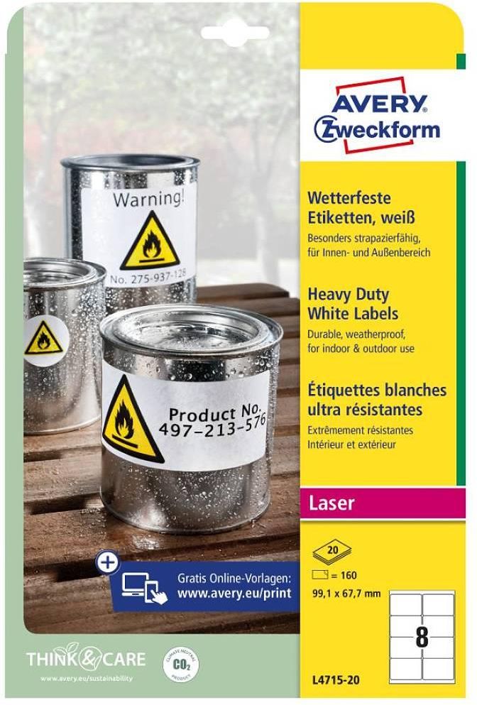 ETYKIETY SAMOPRZYLEPNE A4 AVERY HD 99,1 x 67,7 mm (20 ARKUSZY - 160 ETYKIET) (BIAŁE) Białe, odporne na warunki atmosferyczne etykiety firmy AVERY ZWECKFORM w formacie 99,1x67,7 mm do drukarki laserowej wyjątkowo trwałe, także na zewnątrz. Łącznie 160 etykiet z matowej folii poliestrowej na 20 arkuszach. Silne trwałe przyleganie sprawia, że są one idealne do etykietowania odpornego na warunki atmosferyczne, niezawodnego i trwałego. Wytrzymałe etykiety z folii poliestrowej są odporne na oleje, zabrudzenia, promieniowanie UV i temperaturę (od -20°C do +80°C), a także na wodę i rozdarcia. Są znacznie bardziej wytrzymałe niż standardowe etykiety papierowe. Trwałe, białe etykiety foliowe zapewniające mocną i trwałą przyczepność Odporne na olej, brud, promieniowanie UV i temperaturę (-20°C do +80°C), wodoodporne (także na wodę morską), rozciągliwe. Przyjazne dla środowiska: produkt neutralny dla klimatu, bez PCV Idealne do trwałego użytku wewnątrznego i zewnątrznęgo. Do znakowania zapasów, półek magazynowych i linii produkcyjnych Do wszystkich standardowych drukarek laserowych Cechy produktu Wymiary: 99,1 x 67,7 mm Zawartość: Etykiet: 160 / Arkuszy: 20 Rodzaj zadruku: laserowe, kolorowe Rodzaj kleju: trwałe przyleganie Kolor: biały Powłoka: matowa Materiał wykonania: poliester Gramatura: 75 g/m2 Właściwości materiału: Odporny na warunki pogodowe, Odporny na temperatury, Wodoodporny i odporny na zabrudzenia Kształt: prostokątny z zaokrąglonymi rogami Format arkusza: A4 Przyjazny dla środowiska: Neutralny dla klimatu, Bez PVC, wykonane z materiału pochodzącego z recyklingu i nadające się do recyklingu