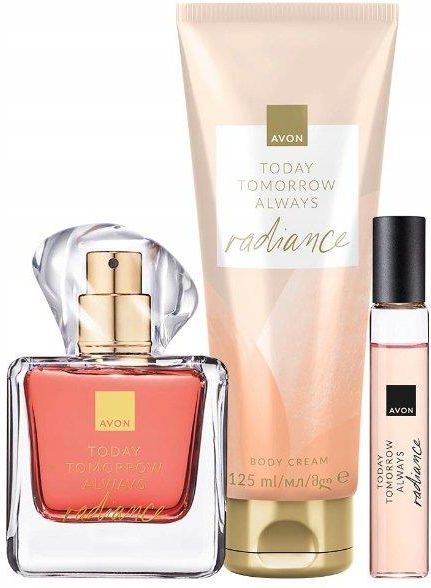 Zestaw kosmetyków Today Tomorrow Radiance !!! to trzy produkty z kobiecej linii zapachowe, która otuli Cię blaskiem i podkręci Twój urok. W zestawie TTA Radiance Woda perfumowana – 50 ml TTA Radiance Perfumetka – 10 ml TTA Radiance Balsam do ciała – 125 ml Kategoria perfum: Pełna radosnego blasku …