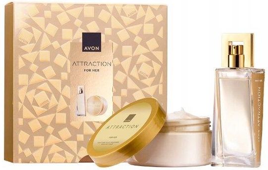 AVON Zestaw upominkowy Attraction dla Niej W zestawie: Woda perfumowana 50 ml Perfumowany balsam do ciała 200 ml WODA PERFUMOWANA ATTRACTION DLA NIEJ 50 ML Porywający trwały zapach, który zbliży was do siebie kuszącą nutą wytrawnych jeżyn, zniewalającym akordem piżma i waniliowym akcentem ambry. …