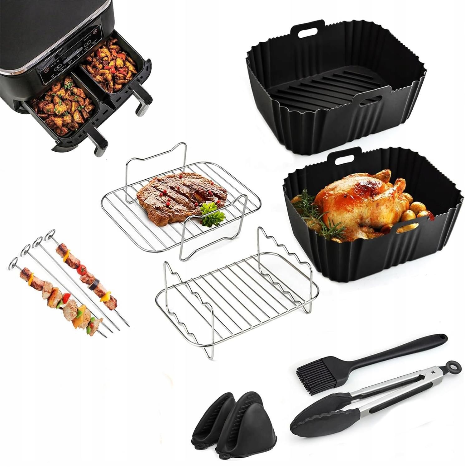 AKCESORIÓW DO FRYTKOWNICY BEZTŁUSZCZOWEJ AIR FRYER 9SZT ZESTAW Zestaw akcesoriów 9-elementowy - Każdy zestaw zawiera 2 silikonowe foremki, 1 wielofunkcyjny grill, 1 metalowy stojak na szpikulce, 4 szpikulce, 1 szczypce do żywności, 100 arkuszy papieru do pieczenia, 1 pędzelek do oleju i 2 klipsy w kształcie dłoni rekina, które pomogą Ci przygotować pyszne i zdrowe posiłki, takie jak frytki, smażony kurczak, szaszłyki itp. oszczędzając jednocześnie czas i energię. 2. Łatwy do czyszczenia i pielęgnacji - Nasze akcesoria do frytkownicy zaprojektowano z myślą o codziennym użytkowaniu i wygodzie. Można myć w zmywarce, są odporne na rdzę i łatwe do czyszczenia, więc nie musisz się o nic martwić JAKOŚĆ MA ZNACZENIE - Akcesoria do gotowania w air fryerach są wykonane z trwałej i solidnej stali nierdzewnej 304 oraz silikonu dopuszczonego do kontaktu z żywnością. Spełniają rygorystyczne wytyczne kontroli jakości, aby uniknąć stosowania BPA i szorstkich materiałów. Są odporne na wysokie temperatury i zapewniają długą żywotność 3. Nadaje się do większości frytkownic powietrznych - Nasze akcesoria do frytkownicy beztłuszczowej idealnie nadają się do podwójnej frytkownicy beztłuszczowej Ninja i pasują do większości marek frytkownic dwustrefowych, takich jak Ninja Foodi AF300EU, AF400EU itp. dzięki czemu nie marnują miejsca we frytkownicy. Zaspokajanie potrzeb całej rodziny 4. Akcesoria do frytkownicy powietrznej ułatwiają osiągnięcie wolności kulinarnej w domu i sprawiają, że przygotowywanie posiłków staje się łatwiejsze i przyjemniejsze. Jeśli w domu są dzieci, mogą one uczestniczyć w przygotowaniach, co nie tylko może poprawić ich umiejętności rzemieślnicze, ale także sprzyjać komunikacji między rodzicami i dziećmi oraz zaspokajać ich głód. Parametr Materiał produktu: Silikon / stal nierdzewna Rozmiar produktu: blacha do pieczenia 19,5*7*12,5 cm Kolor produktu: czarny/srebrny/żółty Kompatybilny z: Większością marek dwustrefowych frytkownic powietrznych, takich jak Ninja Foodi AF300EU, AF400EU itp. Lista treści Blacha do pieczenia * 2 Ruszt do grilla * 1 Szaszłyki mięsne * 4 Grill * 1 Klips w kształcie dłoni rekina * 2 Pędzel do oleju * 1 Klips do żywności * 1 Papier olejowy * 100