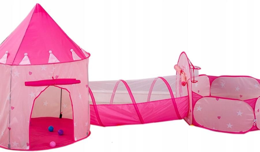 Namiot Różowy 3 w 1 Niezwykły namiot dla zabaw dla dziecka - okrągły, wysoki pałac w różowej kolorystyce, połączony tunelem z kojcem idealnym na suchy basen Jest na tyle mały, że możesz go rozłożyć w pokoju dziecka, ale jednocześnie dostatecznie duży, by pozwolić na swobodną zabawę dziecka i umieszczenie w nim np. maskotek, czy mebelków Namiot jest bardzo lekki, a jego złożenie proste - należy tylko umieścić w nim 4 składane na gumkach pałąki, tynel i kojec z koszykówką rozkładają się automatycznie Namiot posiada pokrowiec - a więc można go łatwo schować, aby nie zajmował miejsca, lub przewieźć ze sobą Wszystkie 3 części namiotu można używać osobno Piłki nie są częścią zestawu Wymiary zamku:Średnica: 100 cmWysokość: 120 cmWymiary tunelu:Średnica: 47 cmDługość: 110 cmWymiary kojca:Podstawa: 110 x 100 cmWysokość: 72 cmOtwór na wejście do tunelu można zasłonić Oświadczamy, że kolory naszych produktów na zdjęciach mogą się nieco różnić od rzeczywistych - wynika to z różnorodności dostępnego sprzętu komputerowego oraz jego indywidualnych ustawień, a w szczególności ustawień monitora i karty graficznej. Zastrzegamy sobie błąd pomiaru do ok. 2 cm.