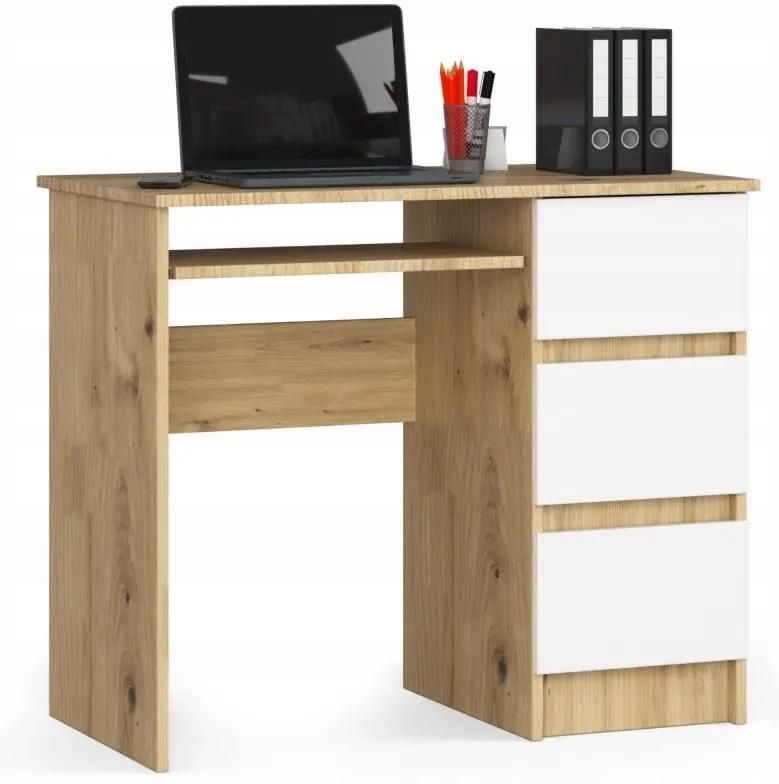 Kolor: Korpus Dąb artisan| Fronty Białe Biurko z płyty laminowanej 16mm odpornej na ścieranie. Widoczne krawędzie oklejone obrzeżem ABS o zwiększonej wytrzymałości na uszkodzenia. Biurko z systemu CLP Wymiary: Długość - 90cm Wysokość - 77cm Głębokość - 50cm Wykonane z płyty laminowanej biurko to produkt charakteryzujący się dużą odpornością na ścieranie, dzięki czemu będzie w stanie służyć w idealnym stanie przez długi czas. Jego uniwersalny wygląd sprawia, że bardzo dobrze będzie prezentowało się w każdym pomieszczeniu. Mebel został wyposażony w blat, wysuwaną półkę oraz trzy pojemne szuflady, które można zagospodarować według indywidualnych potrzeb. Mebel łączy w sobie kolor dąb artisan oraz biały; Produkt cechuje się minimalistycznym designem; Dobrze sprawdzi się w pokoju dziecięcym, młodzieżowym, domowym gabinecie lub biurze; Fronty szuflad zostały wykonane z płyty laminowanej; Szuflady oraz półka pod klawiaturę poruszają się na metalowych prowadnicach rolkowych; Widoczne krawędzie oklejono obrzeżem ABS, które jest gwarantem wyższej odporności na uszkodzenia; Produkt przeznaczony jest do samodzielnego montażu; Instrukcja jest dołączona do zestawu; Mebel posiada 24-miesięczną gwarancję. Biurko komputerowe A-6 90 cm prawe to produkt, który łączy w sobie funkcjonalność, wysoką jakość oraz ponadczasowy wygląd. Produkt można dowolnie łączyć z innymi elementami wyposażenia dostępnymi w ramach tej samej kolekcji. Biurka komputerowe w kolorze dąb artisan/biały doskonale będą prezentowały się zarówno we wnętrzach urządzonych w stylu klasycznym, jak i w nowoczesnych aranżacjach. Łatwe w użytkowaniu oraz utrzymaniu czystości, bez wątpienia spełni oczekiwania klientów, którzy oczekują od wybieranych przez siebie mebli praktycznego zastosowania, prostoty oraz elegancji.