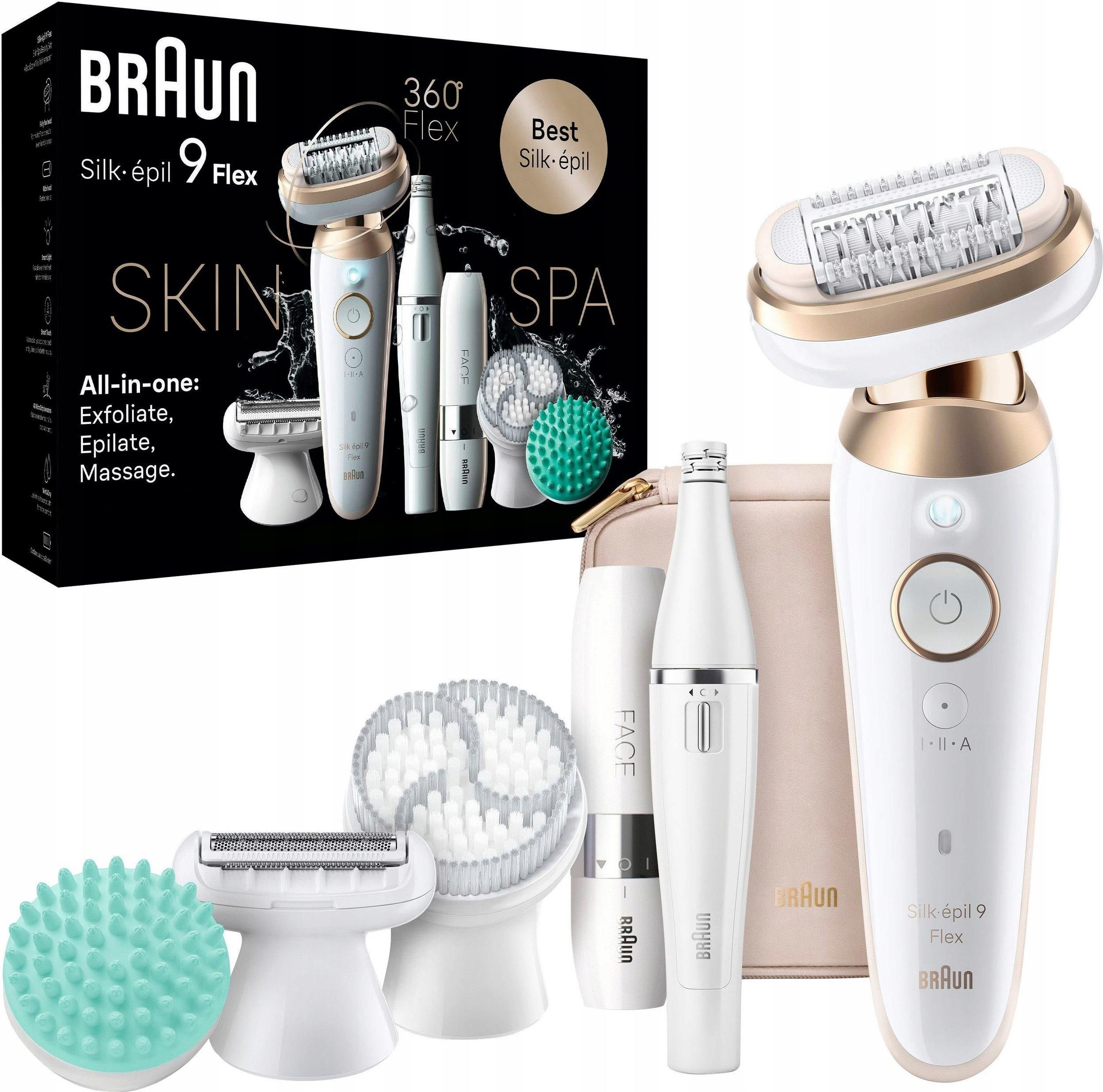 Braun Silk-epil 9 Flex 9-681 Długotrwale gładka skóra: Gładka skóra nawet przez 1 miesiąc, w dowolnym momencie, w zaciszu własnego domu. Ulepsz swoją pielęgnację skóry, aby uzyskać gładkość od stóp do głów: Prosty, 3-etapowy rytuał dla promiennej skóry. Zawiera nakładkę masującą, szczoteczkę do peelingu, minigolarkę do twarzy oraz depilator do twarzy FaceSpa ze szczoteczkami. Pierwsza na świecie w pełni elastyczna głowica: Nie pominiesz żadnego włoska, nawet w trudno dostępnych miejscach. Depilator wychwytuje krótkie włoski (0,5 mm), których nie wychwyci wosk. Mniej bólu i większy komfort: Możliwość stosowania na mokro i na sucho. Delikatnie depiluj w wannie lub pod prysznicem. Zaprojektowane z myślą o wrażliwych miejscach: dzięki funkcji Smart Touch dostosuj siłę nacisku na skórę, aby łatwo przełączać się między trybem mocnym i delikatnym. Promienna, gładka skóra na Twoich warunkach: Bez konieczności umawiania wizyty. Łatwa pielęgnacja, tygodnie gładkiej skóry. Zbudowane, by służyć latami: nasze depilatory są produkowane w Niemczech. Bateria 50 min:  Używaj gdziekolwiek i kiedykolwiek chcesz. Wygodne bezprzewodowe użytkowanie. Inteligentne światło:  ujawnia nawet najmniejsze włoski, dzięki czemu żadnego nie pominiesz   360° Flex i SmartLight W pełni elastyczna głowica. W pełni elastyczna głowica zapewnia gładką skórę nawet do 1 miesiąca, nawet na krągłych obszarach. Inteligentne światło uwidacznia nawet najdrobniejsze włoski, nie pomijając żadnego. Szczotka do peelingu Przygotuj skórę, wykonując peeling, aby zapobiec wrastaniu włosków Nakładka masująca Użyj nakładki masującej, aby ożywić i ujędrnić skórę Nakładka do masażu na mokro i na sucho Na mokro i na sucho, w 100% wodoodporny. Zaprojektowany, aby ograniczyć ból. Delikatna depilacja w wannie lub pod prysznicem. Nakładka masująca. Zaprojektowana, aby delikatniej usuwać włosy i zmniejszyć ból dzięki nakładce masującej Golarka i trymer Głowica goląca zamienia depilator w pełnofunkcjonalną golarkę, a nasadka trymera umożliwia przycinanie włosów, jeśli sobie tego życzysz FaceSpa Dokładnie usuń włoski z twarzy wraz z cebulkami za pomocą depilatora do twarzy i głęboko oczyść pory skóry za pomocą szczoteczki do twarzy