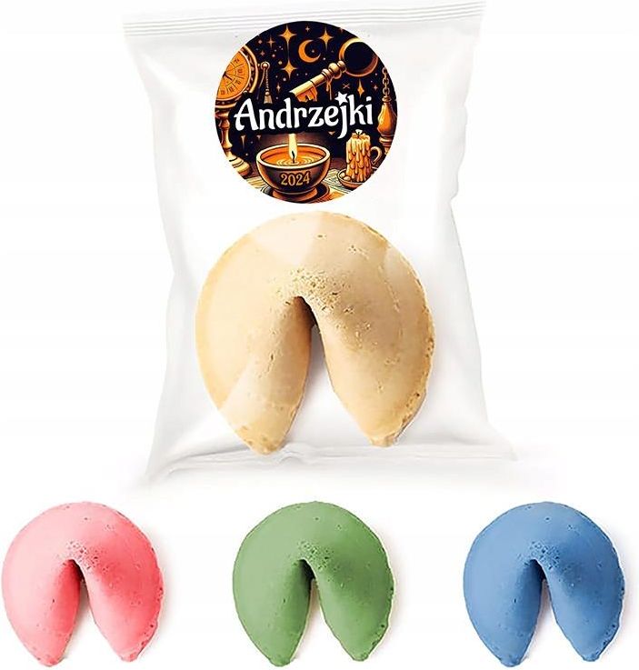 Ciasteczka z wróżbą na Andrzejki, w opakowaniu zawierającym 250 sztuk, stanowią niebanalny dodatek do Twojej imprezy. Jako doskonała propozycja na Andrzejki, te chrupiące ciasteczka nie tylko zachwycają smakiem, ale także każdemu gościowi oferują unikalną wróżbę, która wprowadzi magiczny nastrój i rozszerzy przestrzeń radości i inspiracji. Każda wróżba została starannie przygotowana, aby bawić, inspirować i przynosić pozytywne przesłanie. Tego typu atrakcyjny element wydarzenia nie tylko przełamuje lody, ale i dodaje tajemniczości każdej imprezie. Ciasteczka są indywidualnie pakowane, co zapewnia ich świeżość, kruchość i wyjątkowy smak. Dzięki temu masz pewność, że każdy uczestnik Twojego wydarzenia będzie mógł delektować się delikatnym, chrupiącym ciasteczkiem. Produkt można także personalizować, dodając własne akcenty czy dedykowane kartki, dzięki czemu staje się on jeszcze bardziej wyjątkowy. Istotne: cena dotyczy 250 szt. produkt jest personalizowany dlatego wysyłany jest dopiero po wpłacie na konto data przydatności to 9 miesięcy od daty zakupu ciasteczka zapakowane są w celofanowe woreczki naklejki należy nakleić samemu Ze względu na elektryzowanie się papieru, może się zdarzyć, że wewnątrz ciasteczka znajdą się dwie karteczki z wróżbą lub w jakimś ciasteczku będzie brak wróżby