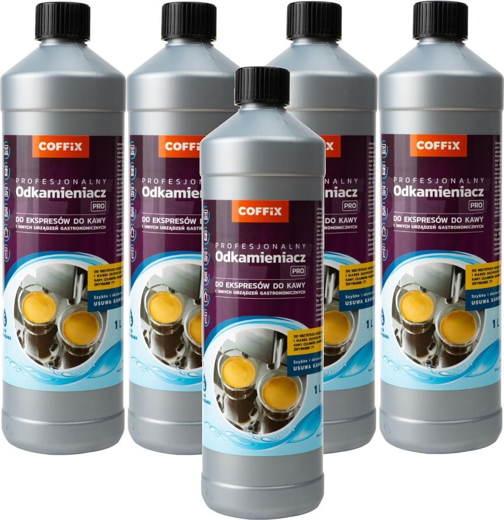 Profesjonalny Płyn do Odkamieniania Ekspresów do Kawy, Czajników i innych Urzadzeń Gastronomicznych COFFIX PRO Zestaw 5x1L Uniwersalny odkamieniacz na bazie kwasów amido i metanosulfonowego do odkamieniania ekspresów do kawy Szybko i skutecznie usuwa kamień! Przeznaczony do odwapniania urządzeń …