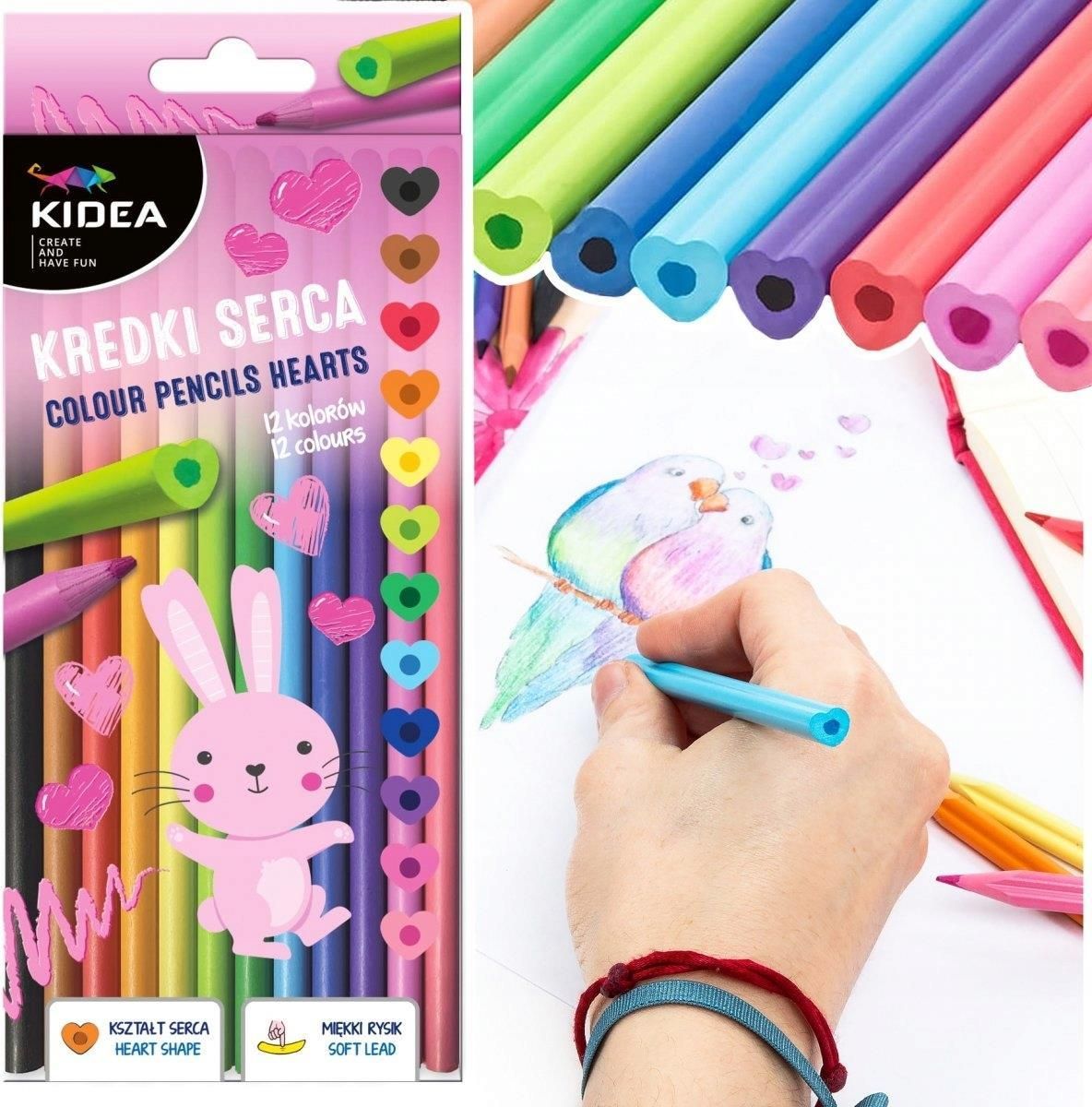 Kredki Ołówkowe Szkolne W Kształcie SERCA Jumbo 12 Kolorów Kidea Kredki ołówkowe w kształcie serduszek w 12 intensywnych kolorach. Miękki rysik sprawia, że kolorowanie i rysowanie jest jeszcze większą przyjemnością, a ich uroczy kształt i wyraziste kolory udekorują pojemnik na kredki lub piórnik. Mimo kształtu serduszka, kredki bez problemu można naostrzyć zwykłą temperówką. Kredki sprawdzą się jako wyjątkowy prezent dla każdego ucznia.