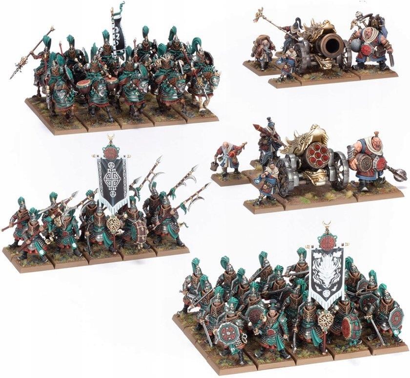 Premiera 05.07.2025 Do samodzielnego złożenia i pomalowania. Nie zawiera farb ani kleju. ---------------------------------------------------------------------------------------------------------- Opis producenta: The vast nation of Grand Cathay is one of the oldest civilisations in the World of Legend, rivalling the great realms of the Elves or Dwarfs in its scope and power. It is a harmonious land that has survived largely unchanged for thousands of years – an empire that stands eternally as a bulwark against the evils of the world. This boxed set builds a solid core of an Armies of Grand Cathay force for use in games of Warhammer: The Old World. Elite Jade Lancers – heavily armoured cavalry – lead the charge to shatter the enemy front lines. Behind them are implacable lines of Jade Warriors, ready to defend your territory or march forward to claim ground. Supporting the attack are two artillery pieces, raining down fire from afar. This boxed set contains 50 multipart plastic miniatures: 2x Cathayan Grand Cannons (which can alternatively be built as Fire Rain Rocket Batteries) 10x Jade Lancers 30x Jade Warriors The miniatures in this box are easy to customise. The Jade Lancers can be assembled as one large unit or two units of five warriors – each with their own optional champion, standard bearer, and musician. The Jade Warriors can be assembled as one large unit, two units of 15 warriors, or three units of 10 warriors – each with their own optional champion, standard bearer, and musician. They can be armed with either a hand weapon and shield or a halberd, and the heads, top knots, and cosmetic accessories are interchangeable across the miniatures. The Cathayan Great Cannons can alternatively be built as Fire Rain Rocket Batteries – both options come with three artillery crews and an optional ogre loader. No matter how you choose to build them, this box makes for a fantastic way to start a new Armies of Grand Cathay force, or expand your collection and save money over buying each kit separately. This kit comprises 734 plastic components, 2x Citadel 25mm by 50mm Rectangular Bases, 2x Citadel 40mm Square Bases, 2x Citadel 60mm by 100mm Rectangular Bases, 10x Citadel 30mm by 60mm Rectangular Bases, and 36x Citadel 25mm Square Bases. This set also includes 1x Jade Warriors/Lancers Transfer Sheet containing 404 high-quality waterslide transfers to decorate your miniatures. These miniatures require assembly and are supplied unpainted – we recommend using Citadel Plastic Glue and Citadel Colour paints. The miniatures in this box will be available separately at a later date. ----------------------------------------------------------------------------------------------------------