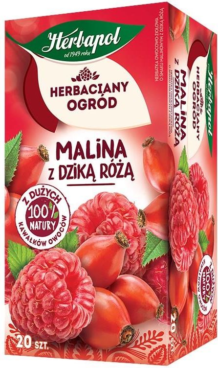 Herbapol Herbaciany Ogród Malina z dziką różą 20tbx2,7g Opis produktu Herbatka owocowo-ziołowa o smaku malinowym z dziką różą. Malina z dziką różą to herbatka, której mocno owocowy smak pochodzi wyłącznie z naturalnych składników. Przez przezroczystą saszetkę możesz zobaczyć duże kawałki owoców, dzięki którym napój jest wyjątkowo smaczny i aromatyczny. Sięgając po Herbaciany Ogród wybierasz to, co najlepsze z natury. Herbatki z linii Herbaciany Ogród to herbatki owocowe o doskonałym smaku. Wyselekcjonowane i starannie zebrane owoce poddawane są dokładnej kontroli, a następnie starannie pakowane tak, aby chronić całe dobrodziejstwo natury. To 100% naturalnych składników. Każda herbatka zapakowana jest w przezroczyste saszetki, przez które ujrzysz duże kawałki owoców, dzięki którym napój jest wyjątkowo smaczny i aromatyczny. Torebka wykonana jest z materiału biodegradowalnego i kompostowanego w warunkach przemysłowych. Herbatka owocowa nie zawiera teiny, co sprawia że można ją pić o dowolnej porze dnia. Szeroki wybór wariantów smakowych sprawia, że herbatki owocowe z linii Herbaciany Ogród mogą pić wszyscy członkowie rodziny – również dzieci. Przechowywać w suchym miejscu. Chronić od światła. Składniki Owoc maliny (40%), kwiat hibiskusa, owoc dzikiej róży (18%), aromat naturalny, owoc bzu czarnego, liść jeżyny. Produkt zawiera wyłącznie naturalne składniki. Wartość odżywcza w 100 ml: Wartość energetyczna – 3 kJ (1 kcal), Tłuszcz: 0 g (w tym kwasy tłuszczowe nasycone: 0 g), Węglowodany: 0 g (w tym cukry: 0 g), Białko: 0 g, Sól: 0 g. Wartość odżywcza w naparze z jednej saszetki (2,7 g): Wartość energetyczna – 6 kJ (1 kcal), Tłuszcz: 0 g (w tym kwasy tłuszczowe nasycone: 0 g), Węglowodany: 0 g (w tym cukry: 0 g), Białko: 0 g, Sól: 0 g. Sposób przygotowania Jedną torebkę zalać szklanką (200 ml) wrzącej wody. Zaparzać pod przykryciem przez 5-7 min. Herbapol. We współpracy z naturą