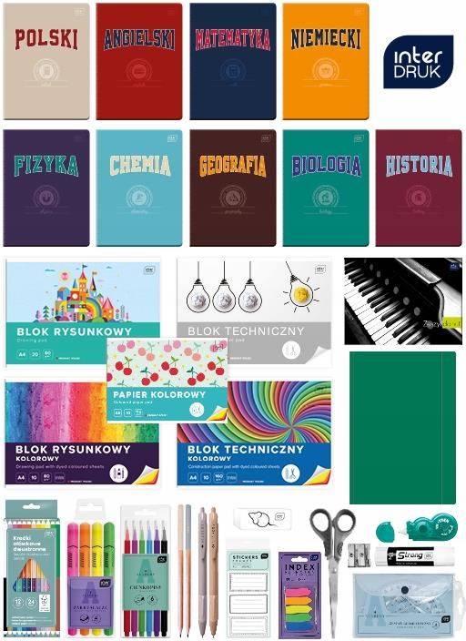 Wyprawka szkolna + zeszyty klasa 4-8 Interdruk (29 elementów) Interdruk Gotowa wyprawka szkolna dla uczniów klas IV-VIII. Interdruk Wyprawka Szkolna Zeszyty Klasa 4-8 Wyprawka szkolna dla klas 4-8 INTERDRUK Jest doskonałym rozwiązaniem przy kompletowaniu akcesoriów dla dziecka. Producent firma Interdruk jest gwarantem najwyższej jakości produktów. Skład zestawu Zeszyt przedmiotowy w linie Interdruk J.Polski A5 60 kartek Zeszyty przedmiotowe w kratkę Interdruk A5 60 kartek: Fizyka Geografia Matematyka Chemia Historia Biologia J.Angielski J.Niemiecki Zeszyt do nut Interdruk A5 16 kartek mix wzorów Naklejki na zeszyty Interdruk Ramki 40x75mm, 9 sztuk, biało-czarny Blok rysunkowy Interdruk, A4 20 kartek biały mix wzorów Blok rysunkowy Interdruk A4 10 kartek kolorowy, mix wzorów Blok techniczny Interdruk A4 10 kartek biały, mix wzorów Blok techniczny Interdruk, A4 10 kartek kolorowy barwiony w masie mix wzorów Zeszyt papierów kolorowych Interdruk, A4, 10 kartek, mix wzorów Teczka kartonowa z gumką Interdruk, A4 +, 300g/m2, zielony Długopis automatyczny Interdruk Academy, z gripem, 2 sztuki, mix kolorów Cienkopis Interdruk Academy, 0.7mm, 6 sztuk, mix kolorów Zakreślacz Interdruk Academy, ścięta, 3mm, 4 sztuki, mix kolorów neonowych Ołówek Interdruk Satin Gold, HB, 2 sztuki, mix kolorów Gumka do ścierana Interdruk Myszka, biały Temperówka Interdruk Satin Gold, metal, 2 otwory, 1 sztuka, mix kolorów Dwustronne kredki ołówkowe Interdruk, trójkątne, 12 sztuk/24 kolory, mix kolorów Klej w sztyfcie Interdruk Strong, 15g, 1 sztuka Nożyczki Interdruk, 15cm, szaro-czarny Zestaw geometryczny Interduk Academy, 4 elementy, przezroczysty Zakładki samoprzylepne Interdruk, strzałki, indeksujące, polipropylen, 12x44mm, 5x50 sztuk, mix kolorów Korektor w taśmie Interdruk Mini Cloud, 6m, 1 sztuka, mix kolorów Interdruk Zeszyty Tematyczne 10szt A5 60 kartek Hybrid Zestaw 10szt zeszytów tematycznych 60 kartek. Format A5. Okładka pokryta lakierem hybrydowym. Zaokrąglone rogi. Produkt z oświadczeniem FSC - dbajmy o środowisko. Zestaw zawiera 10szt zeszytów tematycznych Interduk Zeszyt A5 60 kartek kratka Matematyka Interdruk Zeszyt A5 60 kartek kratka Biologia Interdruk Zeszyt A5 60 kartek kratka Fizyka Interdruk Zeszyt A5 60 kartek kratka Chemia Interdruk Zeszyt A5 60 kartek kratka Geografia Interdruk Zeszyt A5 60 kartek kratka Historia Interdruk Zeszyt A5 60 kartek kratka Informatyka Interdruk Zeszyt A5 60 kartek kratka J. angielski Interdruk Zeszyt A5 60 kartek kratka J. niemiecki Interdruk Zeszyt A5 60 kartek linia J. polski Ołówek Interdruk Satin Gold, HB, 2 sztuki, mix kolorów Stylowy i elegancki ołówek o matowym wykończeniu z serii Satin Gold. Wykonany z naturalnego drewna z barwioną końcówką o okrągłym profilu. Wysoką jakość wykonania podkreślają złote, grawerowane detale. Klej w sztyfcie Interdruk Strong, 15g, 1 sztuka Klej to prosty i szybki w użyciu produkt, który z pewnością znajdzie swoje zastosowanie w biurze, szkole czy domu. Nietoksyczny skład gwarantuje bezpieczne użytkowanie, a specjalnie zaprojektowany sztyft pozwala na precyzyjne aplikowanie kleju. Nietoksyczny i niezawodny - zapewnia wysoką wydajność i oszczędność w zużyciu. Prosty i szybki w użyciu - nie marszczy papieru. Idealnie sprawdzi się do papieru, tektury, etykiet i innych materiałów. Cienkopis Interdruk Academy, 0.7mm, 6 sztuk, mix kolorów Cienkopisy kreślarskie idealne do pisania, podkreślania i precyzyjnego kolorowania. Doskonale sprawdzą się w szkole, jak i również w dekorowaniu kreatywnych prac plastycznych. W zestawie 6 intensywnych kolorów o trójkątnym profilu. Blok techniczny Interdruk, A4, 10 kartek, biały, mix wzorów Przydatny do projektów i szkiców. Przeznaczony do wycinanek, prac manualnych, szkicowania, rysowania kredkami, pastelami. Kolorowe okładki z kredy przyciągają uwagę dzieci. Produkt dostępny w kilku szatach graficznych - wysyłany w zależności od aktualnie dostępnych zapasów magazynowych. Blok techniczny Interdruk, A4, 10 kartek, kolorowy, barwiony w masie, mix wzorów Przydatny podczas prac plastyczno-technicznych. Urozmaicenie projektów i rysunków dzięki kolorowym kartkom. Znajdzie zastosowanie do kreatywnych prac, wycinanek, laurek, projektów plastycznych. Zeszyt papierów kolorowych Interdruk, A4, 10 kartek, mix wzorów Produkt idealny do wszelkich prac kreatywnych. 10 kolorowych kartek z kredy 150 g sklejone na podkładzie z tektury. Produkt dostępny w kilku szatach graficznych - wysyłany w zależności od aktualnie dostępnych zapasów magazynowyc Długopis automatyczny Interdruk Academy, z gripem, 2 sztuki, mix kolorów Komfort pisania zapewnia wygodny gumowy uchwyt. Obudowy długopisów dostępne w kilku wariantach kolorystycznych - wysyłany w zależności od aktualnie dostępnych zapasów magazynowych. Korektor w taśmie Interdruk Mini Cloud, 6m, 1 sztuka, mix kolorów Niezbędny dodatek w każdym piórniku. Super kryjąca taśma korekcyjna odporna na rozerwania. Precyzyjny podajnik taśmy uniemożliwia zsunięcie taśmy. Wygodny w użyciu daje możliwość natychmiastowego pisania - bez konieczności schnięcia. Przeźroczysta obudowa zapewnia widoczny poziom zużycia. Dwustronne kredki ołówkowe Interdruk, trójkątne, 12 sztuk/24 kolory, mix kolorów Zestaw 12 dwustronnych kredek ołówkowych w 24 kolorach. Posiadają trójkątny kształt ułatwiający trzymanie. Kredki Interdruk mają intensywne kolory, są supermiękkie i niełamliwe. Nożyczki Interdruk, 15cm, szaro-czarny Wygodne nożyczki o długości 15 cm. Psiadają precyzyjne ostrze wykonane ze stali nierdzewnej. Gumowy uchwyt zapewnia komfort użytkowania. Zakładki samoprzylepne Interdruk, strzałki, indeksujące, polipropylen, 12x44mm, 5x50 sztuk, mix kolorów Zakładki indeksujące to zestaw malutkich karteczek w 5 neonowych kolorach. Idealne do oznaczania najważniejszych fragmentów w książkach, zeszytach czy podręczn