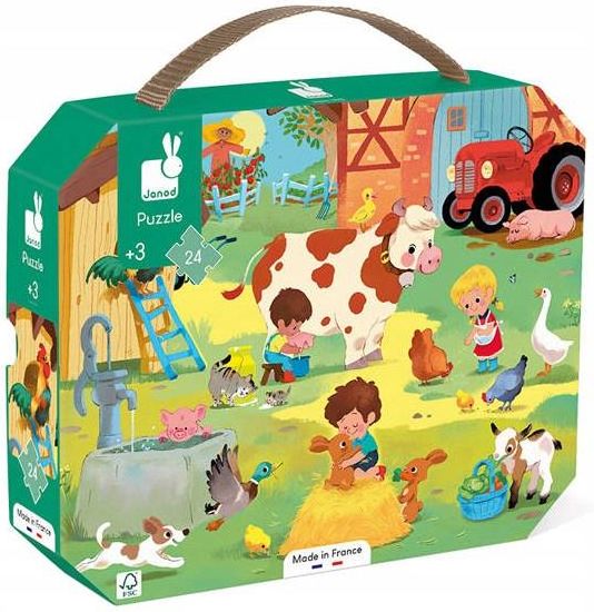 Janod Puzzle W Walizce Dzień Na Farmie 24El a Zestaw puzzli w walizce Dzień na farmie francuskiej marki JANOD składa się z 24 elementów, po ułożeniu tworzących piękny, bogaty w szczegóły obrazek, przedstawiający dzieci, które spędzają aktywnie czas na farmie: jeden z chłopców doi krowę, drugi opiekuje się królikami, a dziewczynka karmi kury. W tle widać stracha na wróble, pilnującego dojrzałych pomidorów, stodołę, traktor i śpiącą w błotku świnkę, z przodu – kurnik i pilnującego go koguta, studnię, z której prosiaczek pije wodę, wesołego psa, kotki, cielaczka i wiele innych interesujących detali. Gotowa ilustracja ma wymiary 50 x 40 cm. Puzzle zostały wykonane z trwałego kartonu FSC (materiału, pozyskanego z lasów zarządzanych w zrównoważony sposób), zaprojektowane i wykonane we Francji. Zapakowane w estetyczną walizeczkę z rączką. Idealnie nadają się na prezent. a Układanie puzzli stymuluje rozwój mózgu dziecka już od najmłodszych lat. To znakomity trening pamięci i koncentracji, który dodatkowo uczy rozpoznawania kształtów oraz logicznego myślenia. Puzzle rozwijają też wiarę we własne możliwości, ćwiczą sprawność manualną dłoni i cierpliwość. Zabawka rozwija: małą motorykę pamięć i koncentrację wiek: 3+ liczba elementów: 24 materiał: karton FSC design: Francja wymiary produktu: 50 x 40 cm waga produktu: 0,34 kg wymiary opakowania: 27 x 5,5 x 21,5 cm bezpieczeństwo i jakość: EN71-1; EN71-2, EN71-3; REACH a Janod od 1970 roku niezmiennie projektuje zabawki, które są synonimem innowacyjności, francuskiego designu i najwyższej jakości. Unikalne zabawki Janod tworzone są z drewna i innych doskonałych materiałów, a przede wszystkim z dziecięcych marzeń!  W obecnej ofercie Janod jest ponad 500 produktów, z których kluczowe to zabawki drewniane, puzzle, układanki i zabawki magnetyczne. Wszystkie produkty projektowane są we Francji przez własnych designerów. Stąd wiele motywów i wzorów powtarza się w kolekcjach, tworząc wyjątkowy, bajkowy świat Janod.  Wszystkie zabawki tworzone są z dbałością o szczegóły, z najwyższej jakości materiałów, bezpiecznych dla dzieci. Zabawki spełniają restrykcyjne normy bezpieczeństwa, takie jak EN71-1, EN71-2, EN71-3 oraz REACH.