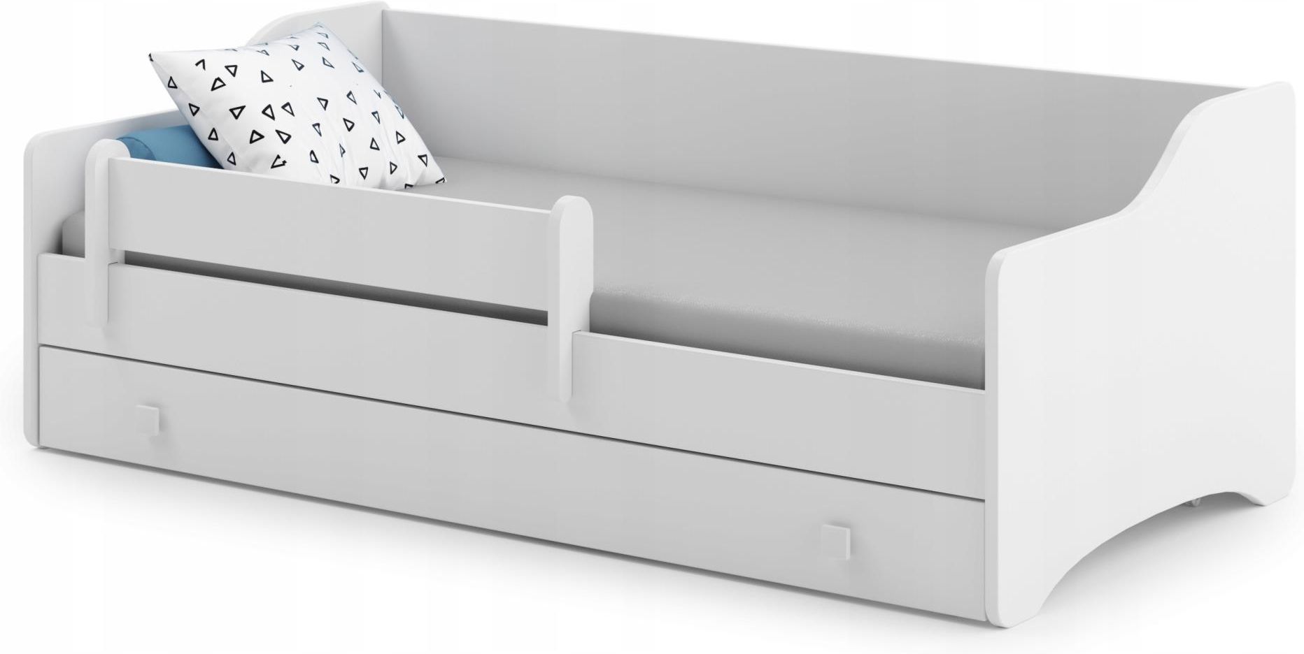 Łóżko dziecięce ERYK Model Eryk to piękne i stylowe łóżeczko które idealnie wpasuje się w pokoju małego chłopca. Korpus łóżeczka wykonany został z wysokiej jakości płyty, zaś stelaż wykonany jest z naturalnego drewna sosnowego. Solidna konstrukcja oraz zaokrąglone krawędzie gwarantują trwałość i bezpieczeństwo użytkowania. Łóżeczko posiada w zestawie szufladę z ozdobnymi uchwytami oraz ruchomą barierkę, która zapewni bezpieczny sen. Prosty, a zarazem efektowny wzór łóżka ERYK sprawdzi się w każdym nowoczesnym wnętrzu INFORMACJE O PRODUKCIE: Wymiary łóżka: 164 cm x 85 cm x 60 cm Powierzchnia spania : 160 cm x 80 cm Wymiary materaca: 160cm x 80cm x 7cm Zaokrąglone brzegi, które nie stanowią zagrożenia dla dziecka podczas snu i zabawy na łóżku W zestawie szuflada na kółkach - która może służyć jako pojemnik na pościel lub na zabawki dziecka Zdejmowana i ruchoma barierka ochronna – 80cm GRATIS! Łóżko wytrzymuje obciążenie do 110 kg ! Odpowiednia wysokość boków łóżka zabezpieczająca przed wypadnięciem Stelaż z listew sprężynujących w systemie FLEX Konstrukcja łóżka wykonana jest z wysokiej jakości płyty meblowej dzięki czemu jest stabilna i wytrzymała Produkt wykonany z certyfikowanych surowców Produkt przeznaczony jest do samodzielnego montażu Uchwyty drewniane w kształcie kwadratów Nasze łóżko cechuje się wysoką jakością i starannością wykonania W skład aukcji wchodzi : łóżko ze stelażem materac piankowy – o grubości 7cm ze zdejmowanym pokrowcem szuflada akcesoria oraz instrukcja do montażu barierka ochronna Materac GRATIS, aby Twój maluch mógł się cieszyć z łóżka zaraz po dostarczeniu paczki Nasze łóżka produkowane są z bezpiecznych i certyfikowanych materiałów! Istnieje możliwość wymiany standardowego materaca na materac PIANKA -KOKOS. W tym celu należy przejść do zakładki: "Wszystkie przedmioty sprzedającego" i dodać do koszyka dopłatę do materaca PIANKA- KOKOS. Na pozostałych naszych aukcjach dostępny jest model ERYK z uchwytami w kolorze czarnym