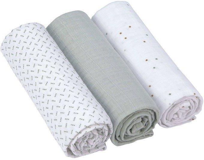 Lassig Muślinowy OItulacz Kocyk About Friends Szop 85x85cm 3 szt.   a Komplet trzech wielofunkcyjnych otulaczy z wegańskiej bawełny niemieckiej marki LASSIG: jeden szaro-zielony, drugi biały ze wzorem w szaro-zielone strzały oraz trzeci – też biały – w bardzo drobne kropeczki w …