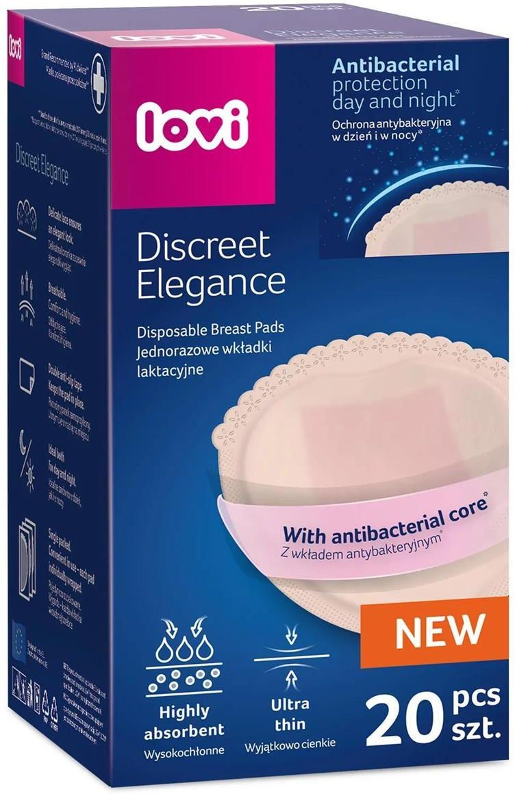 Jednorazowe wkładki laktacyjne DISCREET ELEGANCE Ekskluzywna ochrona w dzień i w nocy Wkładki laktacyjne LOVI Discreet Elegance zapewniają ochronę antybakteryjną dla mamy i dla jej dziecka. Specjalny wkład antybakteryjny, z dodatkiem nano-srebra eliminuje określone bakterie i chroni skórę piersi przed ich działaniem *, co daje jeszcze większą higienę i bezpieczeństwo podczas karmienia. Antybakteryjne wkładki są wysokochłonne, wkład żelujący wchłania wilgoć i utrzymuje ją z dala od skóry, zapewniając uczucie suchości zarówno w dzień, jak i w nocy. Oddychająca struktura, umożliwia swobodny przepływ powietrza, dzięki czemu wrażliwa skóra piersi nie jest narażona na odparzenia. Wkładki z dodatkiem antybakteryjnym są wyjątkowe cienkie i odpowiednio wyprofilowane, wykończone elegancką koronką, więc idealnie dopasowują się do kształtu piersi. Dzięki podwójnemu paskowi samoprzylepnemu wkładka nie przesuwa się wewnątrz biustonosza. Każda wkładka jest pakowana indywidualnie, dla maksymalnej higieny. *Różowy element wkładki posiada właściwości antybakteryjne, jego współczynnik hamujący dla bakterii gronkowca złocistego, E.coli oraz drożdżaka Candida albicans wynosi co najmniej 90% co jest potwierdzone na bazie raportu SGS-CSTC Standards Technical Services (Shanghai) Co., Ltd. antybakteryjne: chronią skórę piersi przed działaniem określonych bakterii* wysokochłonne: doskonale zatrzymują wilgoć wyjątkowo cienkie – tylko 1 mm wygodne: posiadają profilowany kształt oddychające: swobodnie przepuszczają powietrze delikatne dla skóry pakowane oddzielnie dla maksymalnej higieny Jednorazowe wkładki laktacyjne - zapewniają uczucie suchości, zarówno w dzień jak i w nocy. Ochrona antybakteryjna dla mamy i dziecka - specjalny wkład antybakteryjny, z dodatkiem nano-srebra eliminuje określone bakterie i chroni skórę piersi przed ich działaniem * Wysokochłonne - wkład żelujący zatrzymuje wilgoć wewnątrz wkładki nawet do 100 ml, zapewniając uczucie suchości i komfortu. Oddychające - swobodnie przepuszczają powietrze, dzięki czemu skóra piersi nie jest narażona na odparzenia. Dyskretne - wyjątkowo cienkie, tylko 1 mm, dzięki czemu są niewidoczne pod bielizną. Podwójny pasek samoprzylepny – utrzymuje wkładkę na miejscu, zapobiega przesuwaniu się jej wewnątrz biustonosza. Wyprofilowane - doskonale dopasowują się do kształtu piersi. Pojedynczo zapakowane - każda wkładka pakowana jest osobno w szczelną torebkę, dla maksymalnej higieny. W zestawie profilowane wkładki laktacyjne z wkładem żelującym, kolor: beż, ilość: 20 szt.