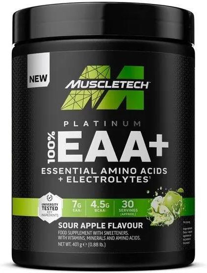 MuscleTech Platinum 100% EAA+ - 401g grams Sour Apple Smak: Kwaśnego Jabłka MUSCLETECH Unikalny stosunek niezbędnych aminokwasów (EAA) Wspiera syntezę białek mięśniowych Siła i regeneracja Zwiększenie siły mięśniowej Wsparcie regeneracji Synteza białek Poprawia nawodnienie Platinum 100% EAA+ to …