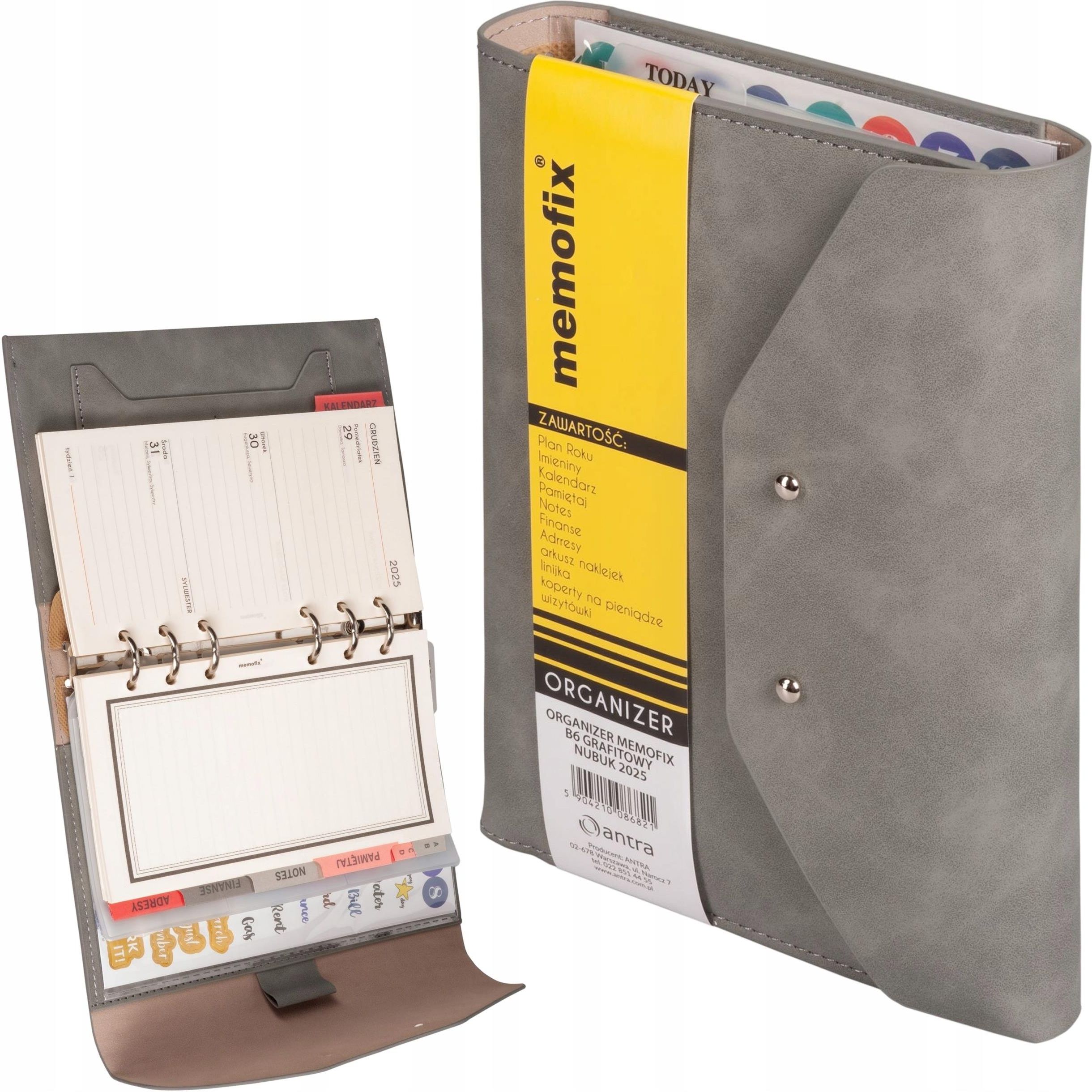 Organizer B6 nubuk 2025 komplet wkładów: roczny plan, listę imienin, Kalendarz 2025, Notes, Finanse, Adresy, Pamiętaj, koperty na wizytówki, arkusz naklejek, linijkę, kopertę na pieniądze oraz przegródkę na wizytówki. Wymiary: 190x125 mm gumkę na długopis ring zapięcie knopik materiał: nubuk oprawa: miękka