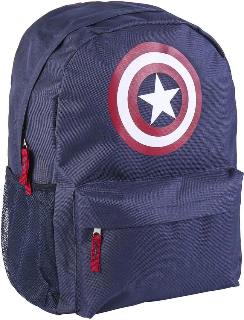 Plecak licencyjny casualowy, Kapitan Ameryka granatowy z elementami czerwonego z nadrukiem tarczy Kapitana Ameryki duża i pojemna komora zamykana na zamek błyskawiczny dodatkowa kieszonka na przodzie plecaka zamykana zamkiem błyskawicznym ergonomiczne i komfortowe plecy plecaka, wygodne regulowane szelki umożliwiające dostosowanie plecaka do wzrostu dziecka uchwyt na górze plecaka do łatwego przenoszenia bądź zawieszenia na haczyku, dodatkowa boczna meshowa kieszonka np. na napój