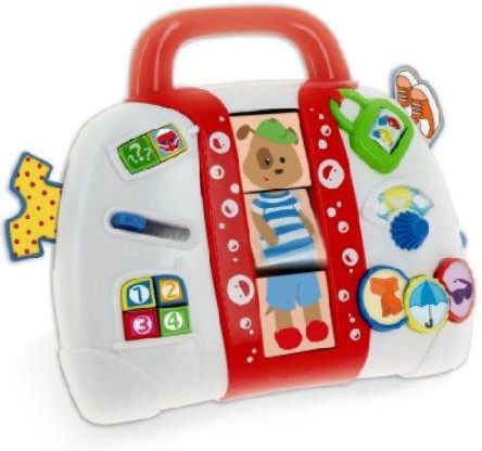 SMILY 14400 INTERAKTYWNA WALIZKA PODROZNIKA INTERAKTYWNA WALIZKA PODRÓŻNIKA Jest edukacyjną zabawką dla każdego małego wędrowca. Wyglądem przypomina małą walizeczkę podróżną i z pewnością przyda się dziecięcemu obieżyświatowi. Przyda się jako element obowiązkowego ekwipunku, dzięki swoim funkcjom dydaktycznym, wśród których wymienić można: uczy nazw ubrań uczy cyferek i kolorów mówi w dwóch językach: polskim i angielskim prosi o odpowiedni zestaw ubrań zależnie od pogody czy też pory roku Dziecko udziela odpowiedzi manualnie, wybierając właściwą odpowiedź poprzez wciśnięcie lub obrócenie odpowiedniego elementu zabawki. A jest ich naprawdę sporo, między innymi: kłódeczka wyskakująca koszulka wyskakujące buciki pokrętełko 3 trzystronne klocki-puzzle z elementami ubiotu Chcesz świata poznać kawałeczek Potrenuj ze mną pakowanie walizeczek !