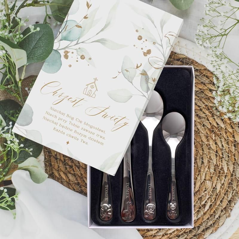 Swistakpakuje.Pl Sztućce Z Grawerem Na Chrzest Św. W Pudełku Liście Eukaliptusa Dobre Miasto