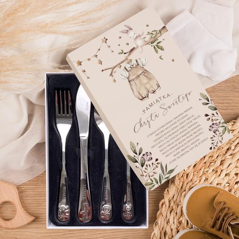 Komplet dziecięcych sztućców w ozdobnym opakowaniu z życzeniami na chrzest święty to idealny prezent. Zestaw składa się z czterech elementów: noża, widelca, łyżki i łyżeczki. Na uchwytach każdego z nich zostanie wygrawerowane imię dziecka. Dodatkowo każdy sztućeczek jest ozdobiony wypukłymi zwierzątkami na końcówce uchwytu. Zestaw znajduje się w eleganckim futerale, który z kolei jest zapakowany w piękne ozdobne pudełko. Na wierzchu opakowania znajduje się motyw chłopięcych ogrodniczek, idealnie pasujący do prezentu na chrzest dla chłopca. Poniżej grafiki z ubrankiem umieszczone są życzenia z okazji tej wyjątkowej okazji. Wymiary: Pudełko: 13 cm x 19 cm x 3 cm.