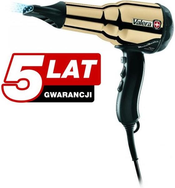 VALERA SWISS MetalMaster Light GOLD Ionic - Złota suszarka do włosów z jonizacją, 2000W Suszarka, została wyposażona w generator jonów ujemnych, który wytwarza ładunki elektryczne zwane jonami ujemnymi, które neutralizują dodatnie ładunki na włosach. Dzięki temu Twoje włosy zostają wygładzone, lepiej się układają i nie elektryzują się. W rezultacie są gładsze i podatniejsze na układanie włosy, zachowujące perfekcyjny kształt. Ta znakomita suszarka dzięki temu, że zamyka łuski włosów powoduje, że włosy są zdecydowanie bardziej lśniące i gładkie. Ponadto są odporne na działanie wilgoci, nabierają połysku i lepiej się układają. Złota Suszarka Valera Metal Master Light Gold to połączenie precyzji, innowacyjnych technologii oraz nowoczesnego designu. Mimo szerokiego wachlarza funkcji pozostaje bardzo łatwa w obsłudze. Suszarka zaopatrzona została w doskonały, bardzo trwały silnik DC Pro Motor Long-Life zapewniający urządzeniu bardzo długą żywotność 1200h pracy ciągłej. Nowoczesna, przyciągająca wzrok stylistyka: elegancki wygląd suszarki Metal Master zawdzięczamy staraniom specjalistów, którzy zaprojektowali obudowę chromowo-metalową powlekaną najwyższej jakości stalą. Producent Valera zadbał w suszarce Valera METAL MASTER Light Gold Ionic ergonomię pracy w każdym calu. Suszarka ma kompaktowe rozmiary, jest ultra lekka 560g. bez przewodu, dysponując przy tym bardzo wydajnym i żywotnym silnikiem DC Pro Motor o mocy aż 2000W z długa żywotnością 1200h. Jednak szwajcarska firma Valera nie poprzestała na tym, zaprojektowali ergonomiczny uchwyt suszarki, z intuicyjnym ustawieniem przełączników regulacji temperatury i mocy nadmuchu. Złota Suszarka Valera METAL MASTER LIGHT Gold Ionic posiada wiele udogodnień: suszarkę wyposażono w ultra wąski koncentrator powietrza, pozwala zwiększyć prąd powietrza nawet o 20%, zdejmowana metalowa tylna osłona wentylatora ułatwia konserwacje suszarki, przewód zasilający o długości: 3,00 m. Parametry techniczne: Mocny i długo żywotny silnik DC Pro-Motor - 2000 W do 1200h pracy ciągłej, Generator jonów ujemnych - włosy nie będą się więcej elektryzować, zaczną naturalnie lśnić i lepiej się układać, przepływ powietrza: 60m3/h, przycisk zimnego nawiewu, zimny strzał, ergonomiczne ustawienie przełączników, ułatwiające pracę ciągłą, 6 kombinacji nawiewu i temperatury - 3 temperatury i 2 prędkości, ultra wąski koncentrator powietrza, pozwala zwiększyć prąd powietrza nawet o 20% zdejmowana metalowa osłona silnika waga około 560g. bez przewodu, 3 metrowy, suszarka w zestawie z dyfuzorem i pokrowcem ochronnym, efektowna obudowa w kolorze złotym, Produkowana w Szwajcarii Suszarka z jonizacją dlaczego jest tak ważna ? Jak działa ? Z natury nasze włosy są naładowane ładunkami dodatnimi. Temperatura i proces stylizacji włosów dodatkowo potęguje zwiększenie tych ładunków, co przekłada się na zwiększenie elektryczności statycznej włosów. Jony dodatnie wpływają niekorzystne na włosy otwierając ich łuskę. Włos stając się chropowaty, tępy, zaczyna tracić naturalny poziom nawilżenia pozostawiając je matowymi i pozbawionymi kondycji. Wbudowany w suszarce generator wytwarza jony ujemne neutralizujące jony dodatnie, usuwając w ten sposób z fryzury całą elektryczność statyczną. Włosy z odpowiednio zamkniętymi łuskami stają się miękkie, błyszczące i łatwe w układaniu. Opinie ekspertów również wskazują iż technologia jonów ujemnych pozwala zwiększyć dobroczynne działanie produktów pielęgnacyjnych włosy. Zalety jonizacji w suszarkach: eliminowanie ładunków dodatnich, efektywna redukcja elektryzowania się włosów, dokładne zamknięcie łuski włosa, włosy stają się gładkie i lśniące, poprawa nawilżenia włosów , włosy nie tracą swojej wilgotności, zyskują elastyczność i połysk, zwiększenie podatności włosów na zabieg modelowania, technologia jonów ujemnych pozwala zwiększyć dobroczynne działanie produktów pielęgnacyjnych włosy, Gwarancja 24 - miesiące