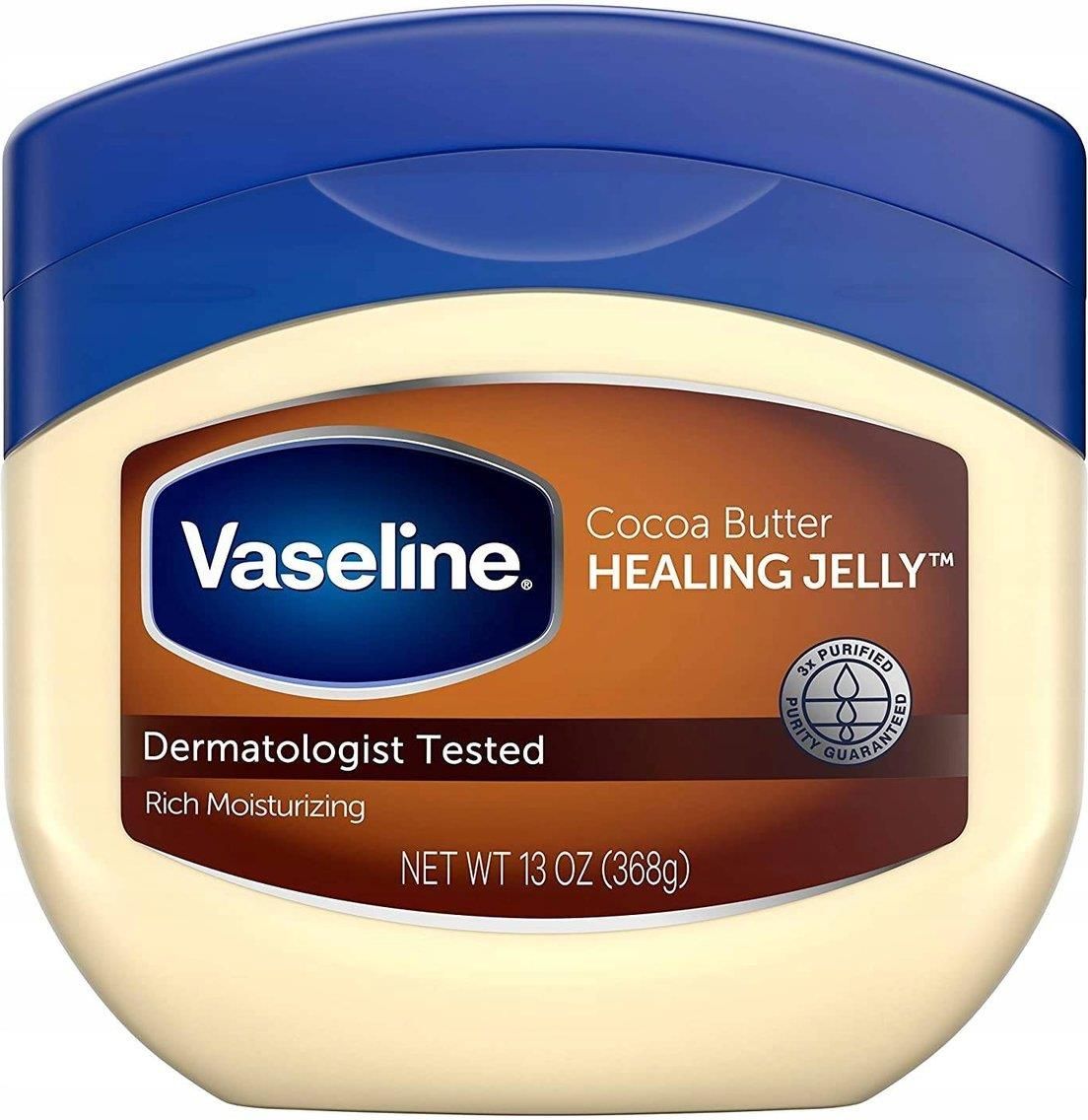 VASELINE Cacao Butter HEALING JELLY wazelina 368 g Vaseline Cacao Butter HEALING JELLY WAZELINA DO CIAŁA waga 368 g Vaseline Cacao Butter to połączenie białej wazeliny z masłem kakaowym, co oprócz intensywnego i długotrwałego nawilżania, sprawia że skóra pięknie pachnie. Vaselina chroni skórę, łagodzi wszystkie zaczerwienienia i podrażnienia. Skóra jest piękna i zdrowa. Testowana dermatologicznie.