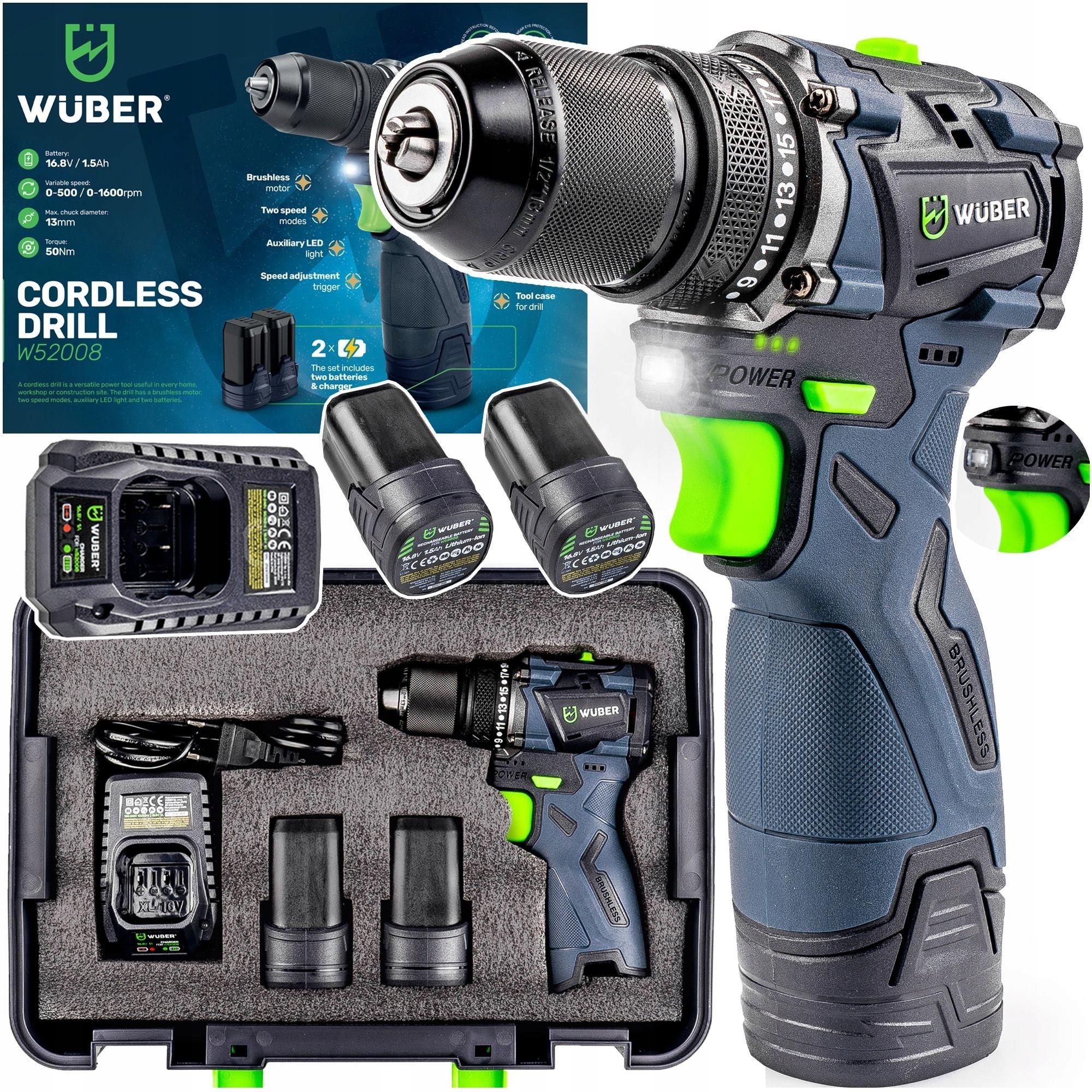 AKUMULATOROWA WIERTARKO WKRĘTARKA 16.8 V WUBER Prędkość obrotowa 1600 obr/min ► 2x Akumulator 16.8 V 1.5 Ah ► Antypoślizgowa rękojeść ► Walizka transportowa ► Ładowarka ► Brak pamięci ładowania ► 2 tryby pracy ► Sprzęgło 21+1 ► Oświetlenie LED ► Panel z diodami sygnalizującymi stopień naładowania ► …