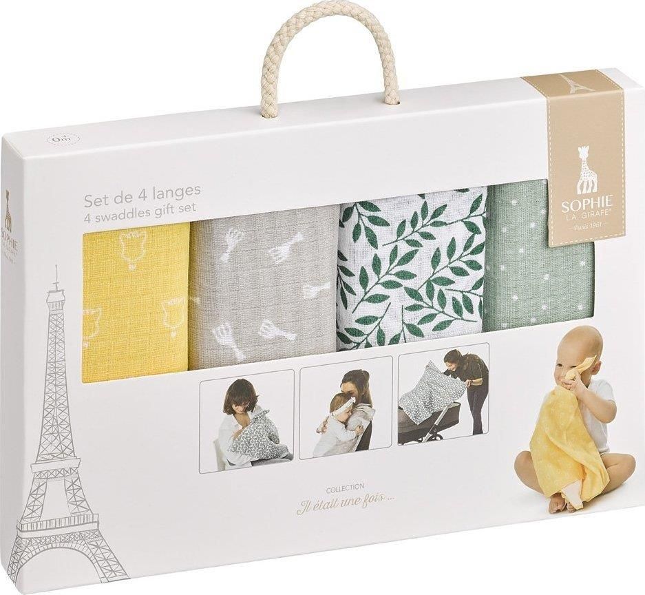 Referencja: 850800\n\nKategoria wiekowa: 0m+\n\nPiękny zestaw 4 pieluszek z ładnymi nadrukowanymi wzorami.\n\nKażda pieluszka ma inny nadruk i kolor:\n \n \n zielona pieluszka o odcieniu szałwi jest z białymi kropkami,\n biała pieluszka z nadrukiem jodłowo-zielonego liścia,\n szara pieluszka z białym nadrukiem wizerunku Żyrafy Sophie,\n złotożółta pieluszka ma biały nadruk głowy Żyrafy Sophie i małego serduszka.\n \nZnajdują idealne zastosowanie nie tylko jako akcesoria dla dzieci, to jest :\n\npieluchy Żyrafy Sophie są również używane do:\n\n\n \n kocyk dziecięcy\n ochraniacz wózka\n ochrona przewijaka\n śliniak\n \n\nale także jako ekstra bandamka czy osłona na głowę również dla starszaka czy mamy i taty\n\nTetra to bardzo trwały materiał, który w miarę prania staje się coraz bardziej miekki.\n\nOpakowane w piękne białe pudełko z uchwytem z bawełnianego sznurka nadają się idealnie na prezent.\n\n\n\n\nWymiary pieluszki : 70 x 70 cm.\n\nMożna prać w pralce w temperaturze 40 C.\n\n\n
