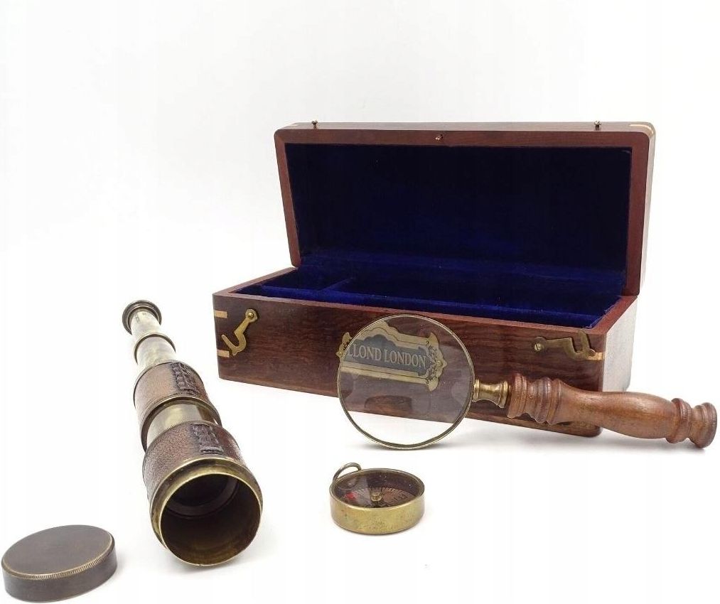 Zestaw upominkowy – Luneta + Kompas + Lupa 226698 Zestaw upominkowy, w którego skład wchodzą: luneta, kompas i lupa sprawdzi się jako oryginalny prezent dla podróżnika, żeglarza i ciekawego świata odkrywcy. Luneta, kompas oraz szkło powiększające stylizowane są na przedmioty nadszarpnięte zębem czasu, co na pewno przypadnie do gustu miłośnikom historii i gadżetów w stylu retro. W skład zestawu wchodzi drewniane pudełko z przegródkami na poszczególne przedmioty. Wnętrze pudełka zabezpieczone jest materiałem w kolorze szafirowym. Takie wykończenie nadaje całości eleganckiego charakteru i sprawia, że zestaw w tej formie nadaje się na prezent. Zestaw świetnie współgra z aranżacjami gabinetowymi, angielskimi oraz w stylu retro. Przedmioty będą też ciekawą ozdobą kapitańskiej kajuty. Zestaw upominkowy 226698 specyfikacja: Luneta: Materiał wykonania: szkło, mosiądz, skóra Kolor: złoty, mosiężny, beżowy Przybliżenie kilkukrotne Wymiary: dł. 40cm Kompas: Materiał wykonania: szkło, mosiądz Kolor: złoty, mosiężny Wymiary: śr. 3,5cm Lupa: Materiał wykonania: szkło, mosiądz, drewno Kolor: złoty, mosiężny, brązowy Przybliżenie Wymiary: dł. 17cm, śrdenica 6,5cm Pudełko: Materiał wykonania: drewno Kolor: brązowy, szafirowy Zamykane na zatrzask Wymiary: 23 x 10 x 8 cm Zestaw upominkowy MIS-0066 sprawdzi się jako: Prezent dla kapitana Prezent dla odkrywcy Elegancki prezent dla miłośnika historii Gadżet w stylu retro do domu Prezent dla żeglarza Prezent dla podróżnika