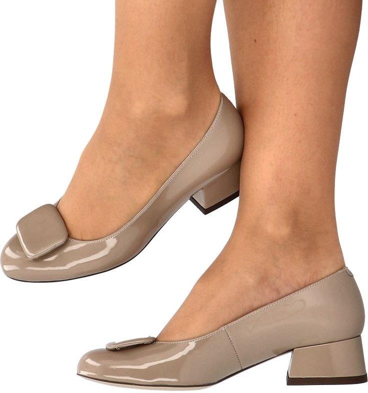 Eleganckie czółenka damskie wykonane ze skóry naturalnej lakierowanej w modenym kolorze cappuccino. Model pochodzi z kolekcji renomowanej firmy KOTYL. Posiadają niski oraz szeroki obcas o wysokości 3,5 cm. Na przodzie buta ozdoba w kształcie prostokąta, nadająca butom oryginalności. Model wykonany ze skóry naturalnej zarówno na zewnątrz, jak i w środku. Świetnie sprawdzą się na bardziej oficjalne okazje, ale mogą również służyć na co dzień np. do pracy. Doskonałe na co dzień i perfekcyjne na wieczór. Wygodne i wyjątkowo eleganckie. Idealne połączenie klasyki, nowoczesności i elegancji. Do butów dodajemy zapasowy komplet fleków, tak abyś mogła dłużej bezstresowo cieszyć się z użytkowania zakupionego obuwia.