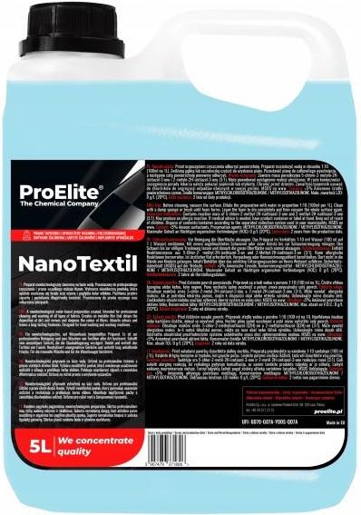 PROELITE NANOTEXTIL 5LKoncentrat do prania tapicerek samochodowych z nanocząsteczkamiProdukt przeznaczony do czyszczenia tapicerek, powierzchni tapicerowanych i dywanów. Unikalny skład, stworzony na bazie nanocząsteczek, pozwala pozbyć się każdego rodzaju zabrudzeń, a kolor czyszczonej powierzchni pozostaje ożywiony. Wytworzona powłoka ochronna sprawia, że kurz nie osiada tak szybko. Produkt zaleca się rozcieńczyć przed użyciem, dzięki czemu jest jeszcze bardziej wydajny.Dedykowany do :Samochody osoboweTiRBusyKanapyFoteleDywanyWykładzinyPłyn do prania tapicerki samochodowej - Jak stosować?Koncentrat należy rozcieńczyć z wodą przed użyciem. Zaleca się proporcję 1:10. Przed aplikacją preparatu, należy dokładnie odkurzyć czyszczoną powierzchnię i wstrząsnąć przygotowany roztwór. Produkt należy rozprowadzać czystą, zwilżoną gąbką do momentu wytworzenia się piany. Pozostawić na kilka minut, a następnie odkurzyć pozostałości. Nie dopuszczać do zaschnięcia.Płyn do prania tapicerki - Gdzie stosować?Płyn do prania z nanocząsteczkami świetnie sprawdzi się w profesjonalnym użyciu oraz w warunkach domowych. Można stosować zarówno do prania tapicerek i elementów tapicerowanych, jak i do prania dywanów o różnych strukturach.INFORMACJE SZCZEGÓŁOWE:Silny koncentrat z nanocząsteczkami do prania tapicerek oraz dywanów. Stworzony na bazie unikalnego składu z udziałem nanocząsteczek. Produkt, pozwala na pozbycie się każdego rodzaju brudu oraz nieprzyjemnego zapachu. Pozostawia warstwę ochronną, dzięki której kurz nie osiada tak szybko. Środek należy rozcieńczyć przed użyciem, przez co jest jeszcze bardziej wydajny.Typ:KoncentratWydajność:Wysoka – duże stężenie substancji aktywnychDostępne opakowania:1L, 5LDozowanie:Rozcieńczenie: 1:10Przed rozpoczęciem czyszczenia, odkurzyć powierzchnię. Koncentrat lub rozcieńczony roztwór należy wstrząsnąć przed użyciem. Zwilżoną gąbką czyścić powierzchnię do uzyskania piany. Pozostawić pianę do całkowitego wyschnięcia, a następnie całą powierzchnię odkurzyć. Nie dopuścić do przemoczenia powierzchni.Bezpieczeństwo:Bez NTA – substancji rakotwórczychBez rozpuszczalnikówDziała w zakresie pH 6,93 – 6,97Płyn do prania tapicerki z nanocząsteczkamiDoskonały koncentrat do prania tapicerki z nanocząsteczkami, opracowany na bazie unikalnego składu. Doskonale czyści każdy rodzaj zabrudzeń, pozostawiając tapicerkę w świetnej kondycji! Niezwykle wydajny, silny koncentrat posiada właściwości piorące, mocno się pieni i usuwa każdy brud. Tworzy niewidzialną powłokę zabezpieczajacą, dzięki której czyszczona powierzchnia staje się odporna na nowe zabrudzenia. Dodatkowo pozostawia przyjemny, świeży zapach. Jest w pełni bezpieczny dla zdrowia i tkanin.